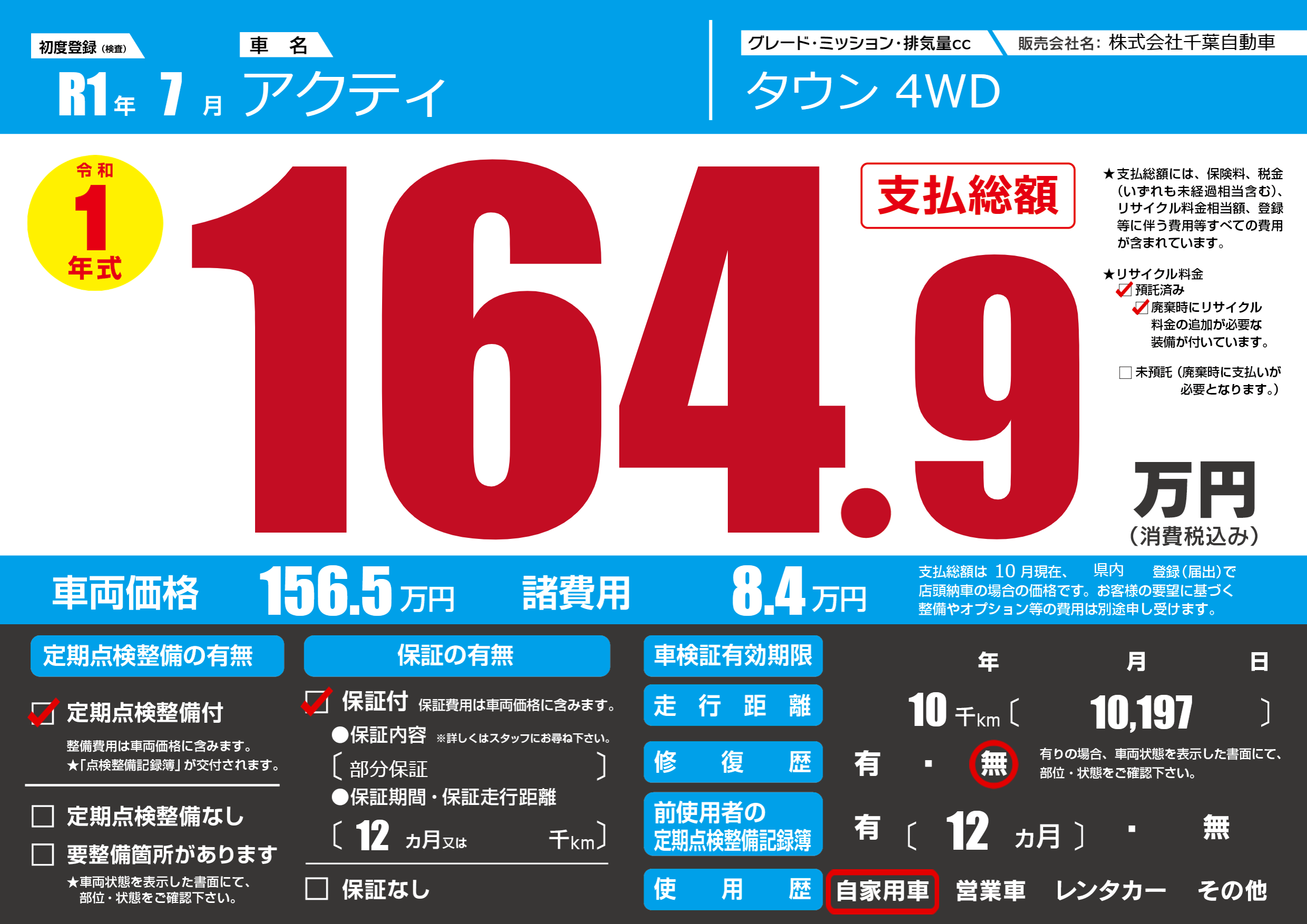 | 走行キロ | 1万km | 初年度登録 | R1年7月 |