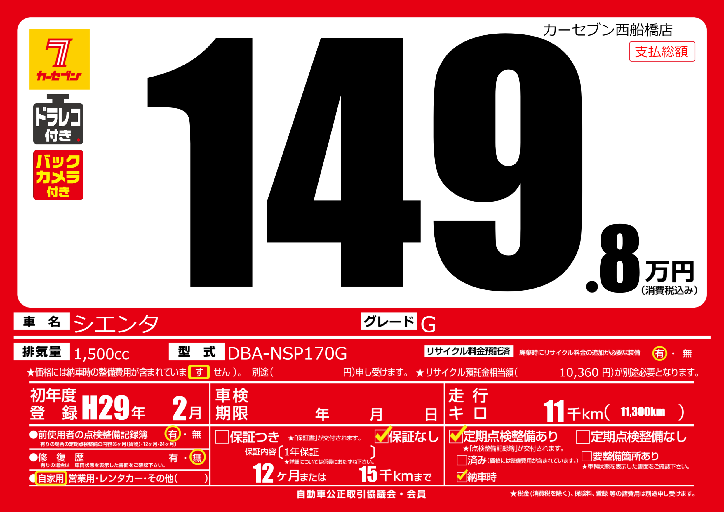 | 定期点検整備 | 定期点検整備あり 納車時あり | ||