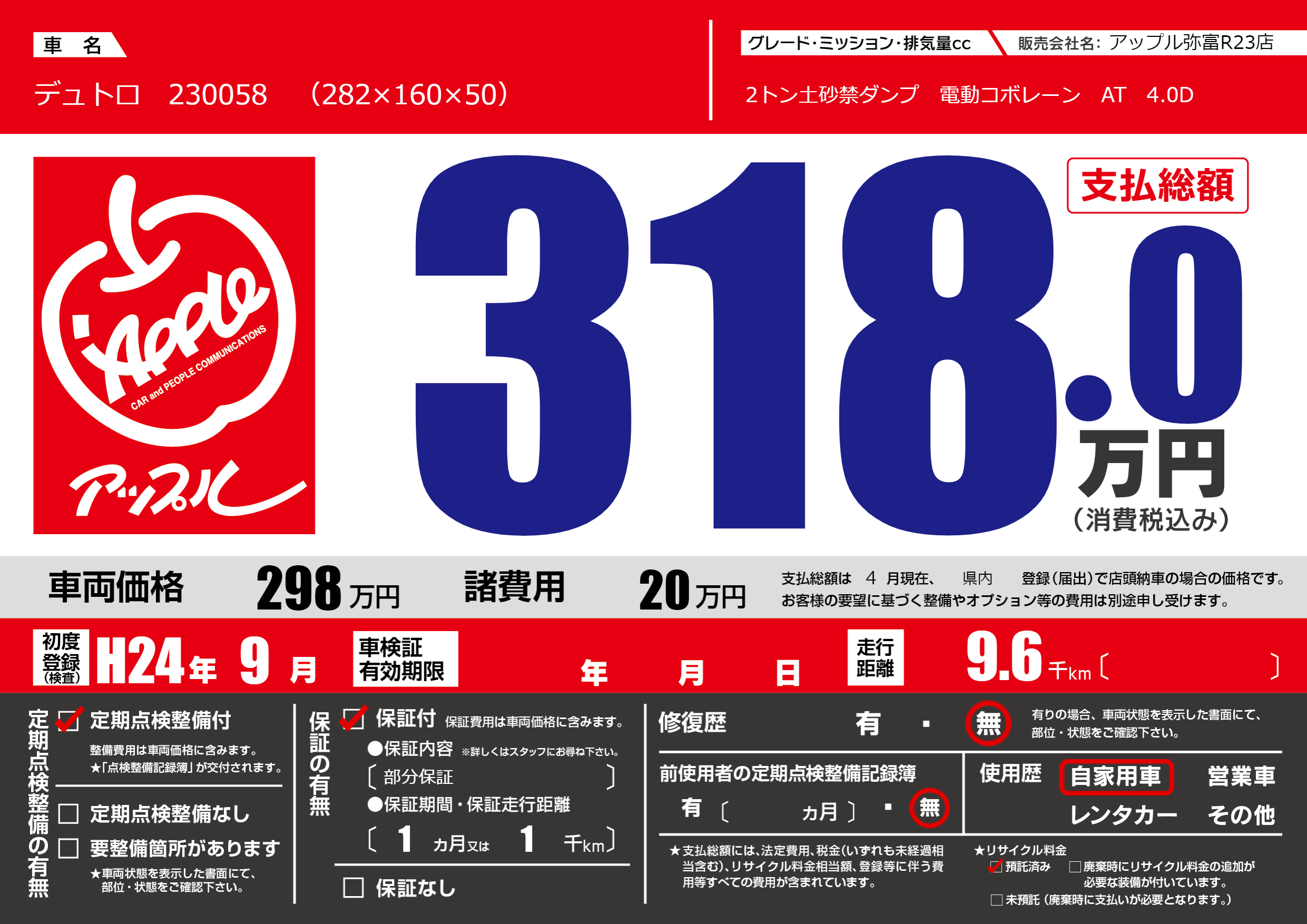 | 車名 | デュトロ 230058 (282×160×50) | グレード ミッション 排気量 |
