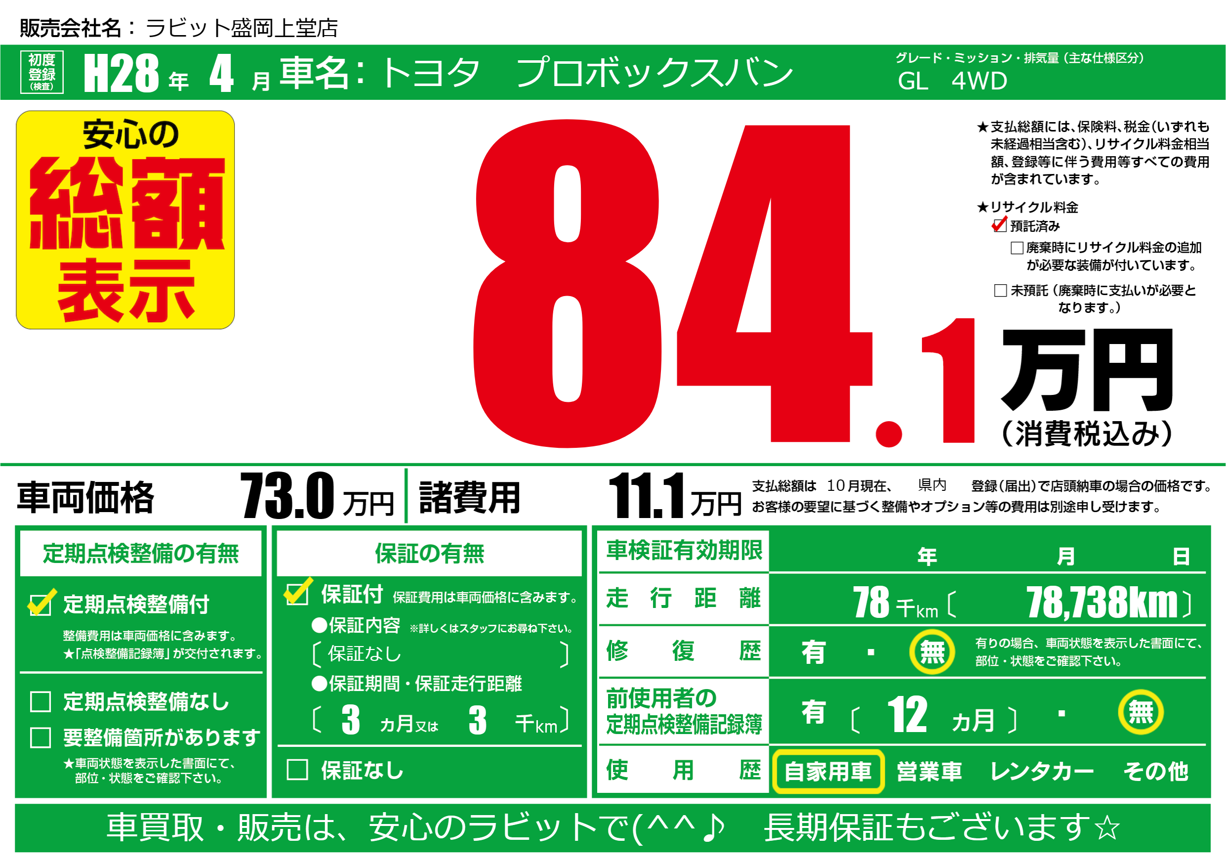 | 車名 | トヨタ プロボックスバン | グレード ミッション 排気量 |