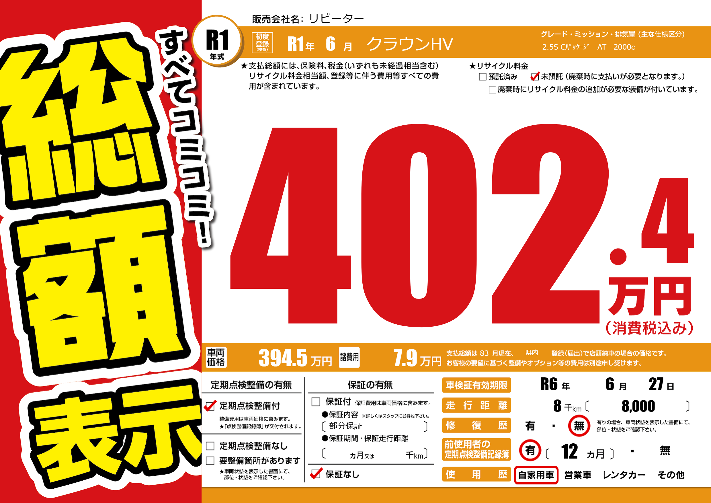 | 車名 | クラウンHV | グレード ミッション 排気量 |