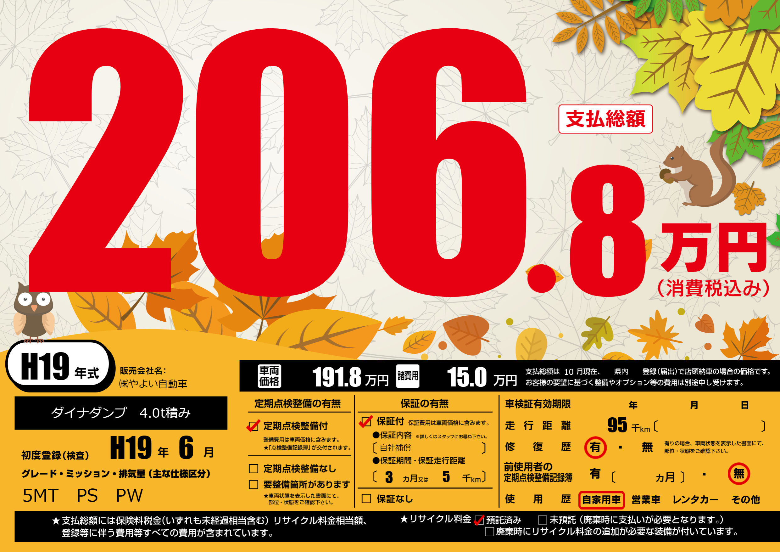 保証付き 保証内容(自社補償) 3ヶ月または(5)千kmまで |