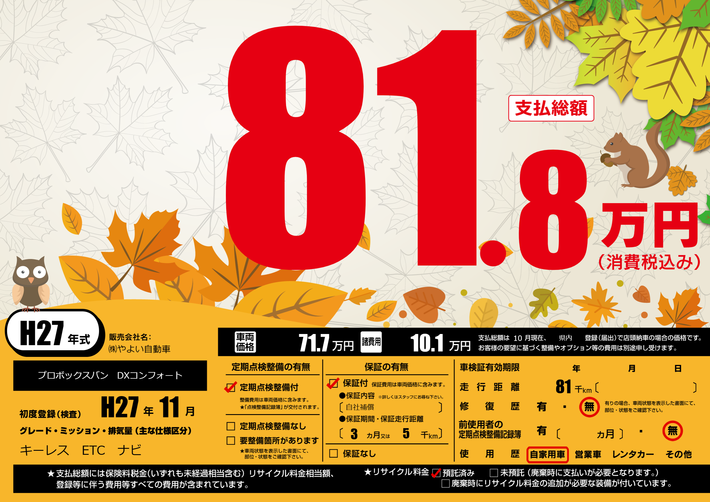 | 走行キロ | 8.1万km | 初年度登録 | H27年11月 |