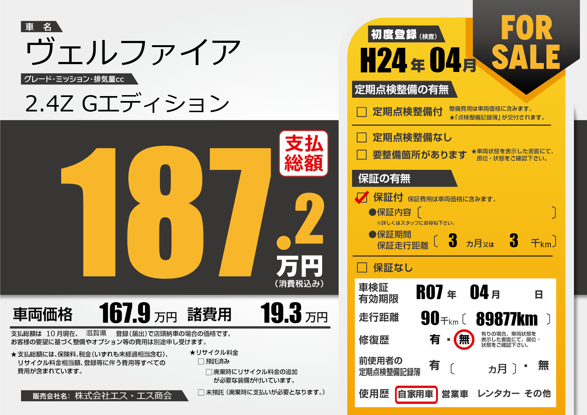 | 車名 | ヴェルファイア | グレード ミッション 排気量 |