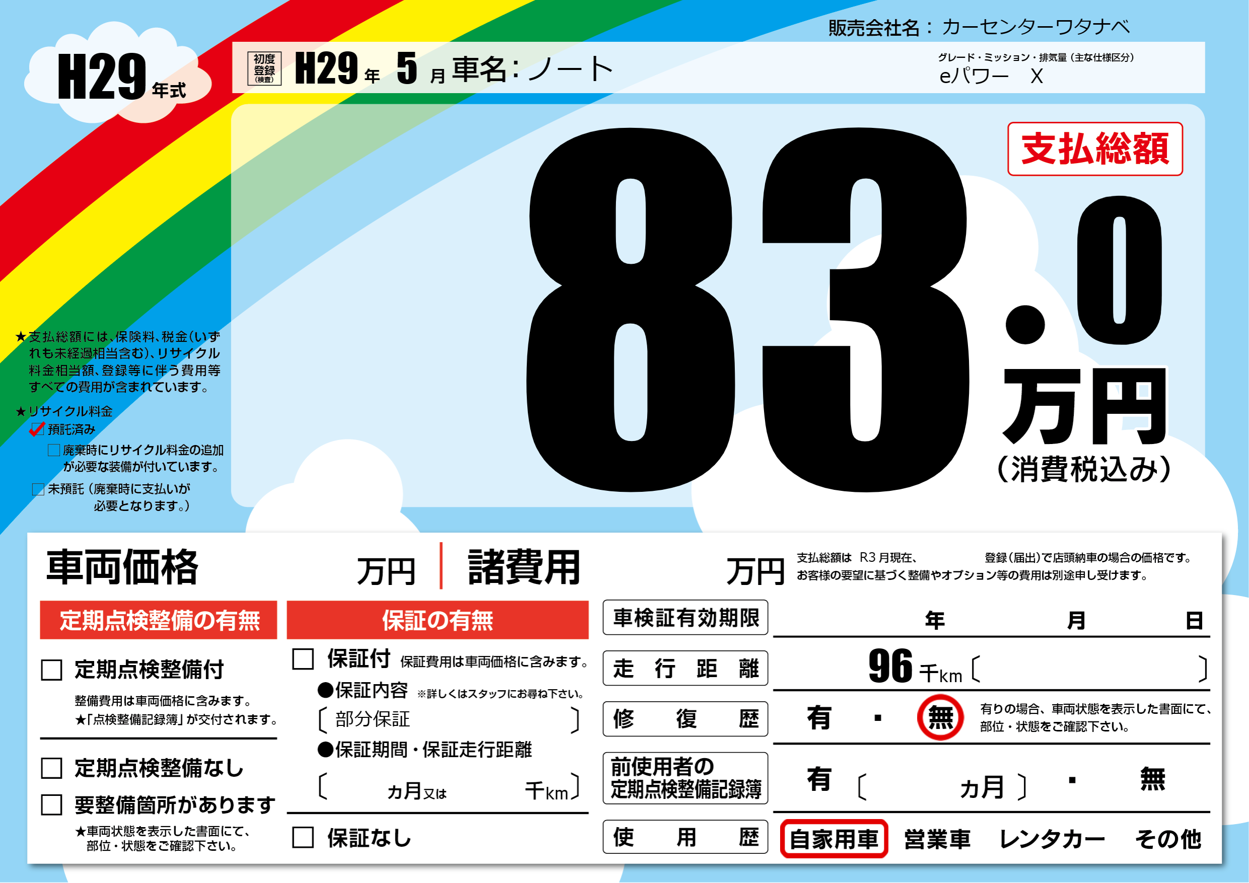 保証なし 保証内容(部分保証) ---ヶ月または()千kmまで |