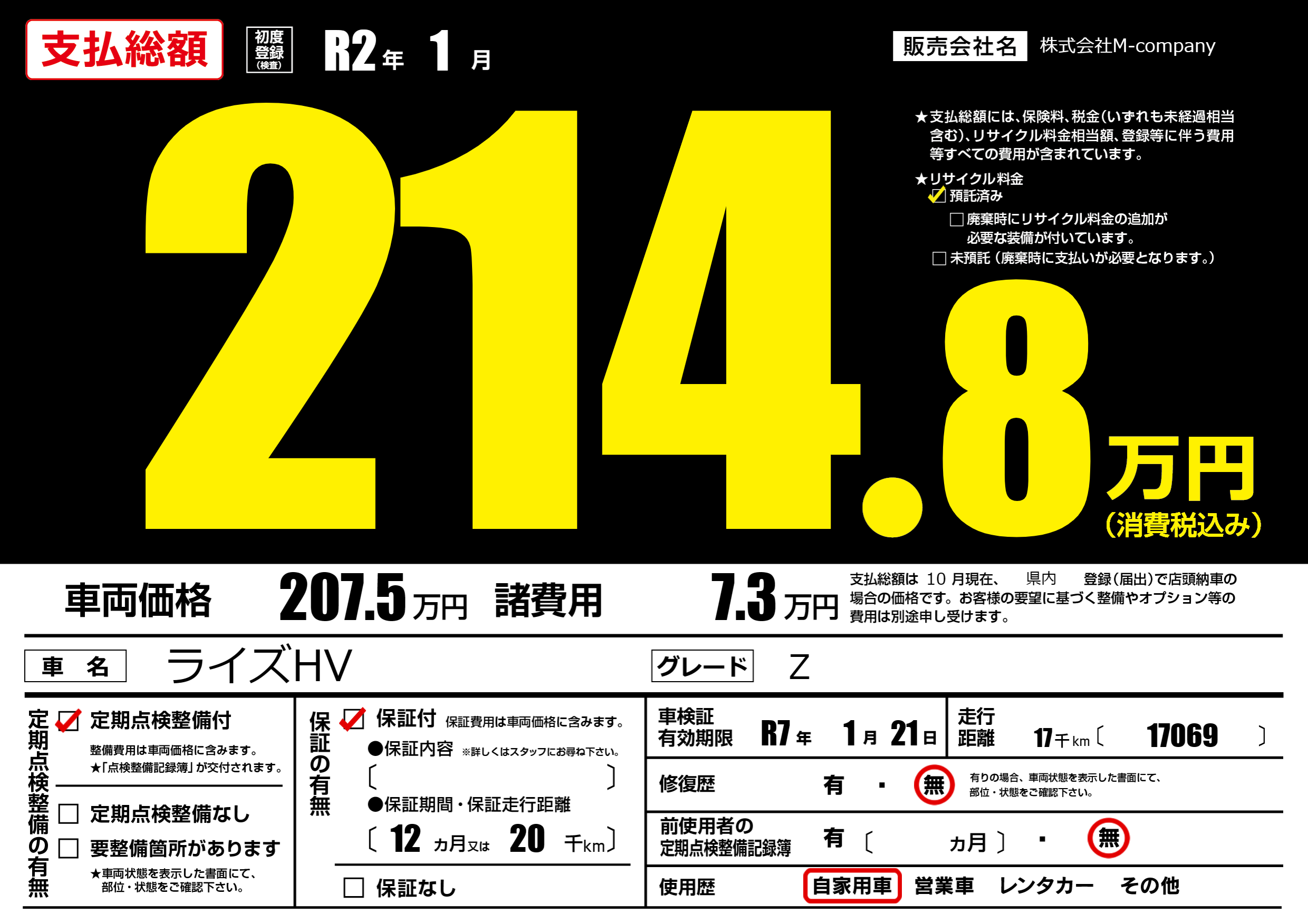 なし | 車検制限 | R7年1月21月 |