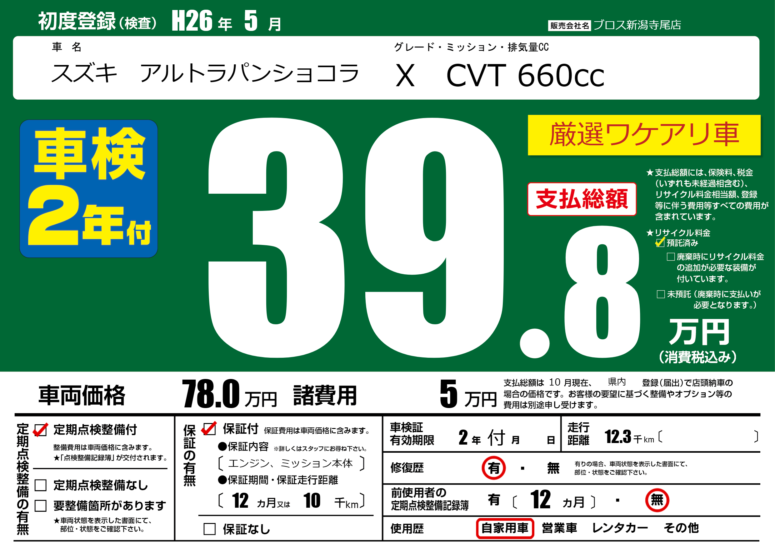 | 車名 | スズキ アルトラパンショコラ | グレード ミッション 排気量 |