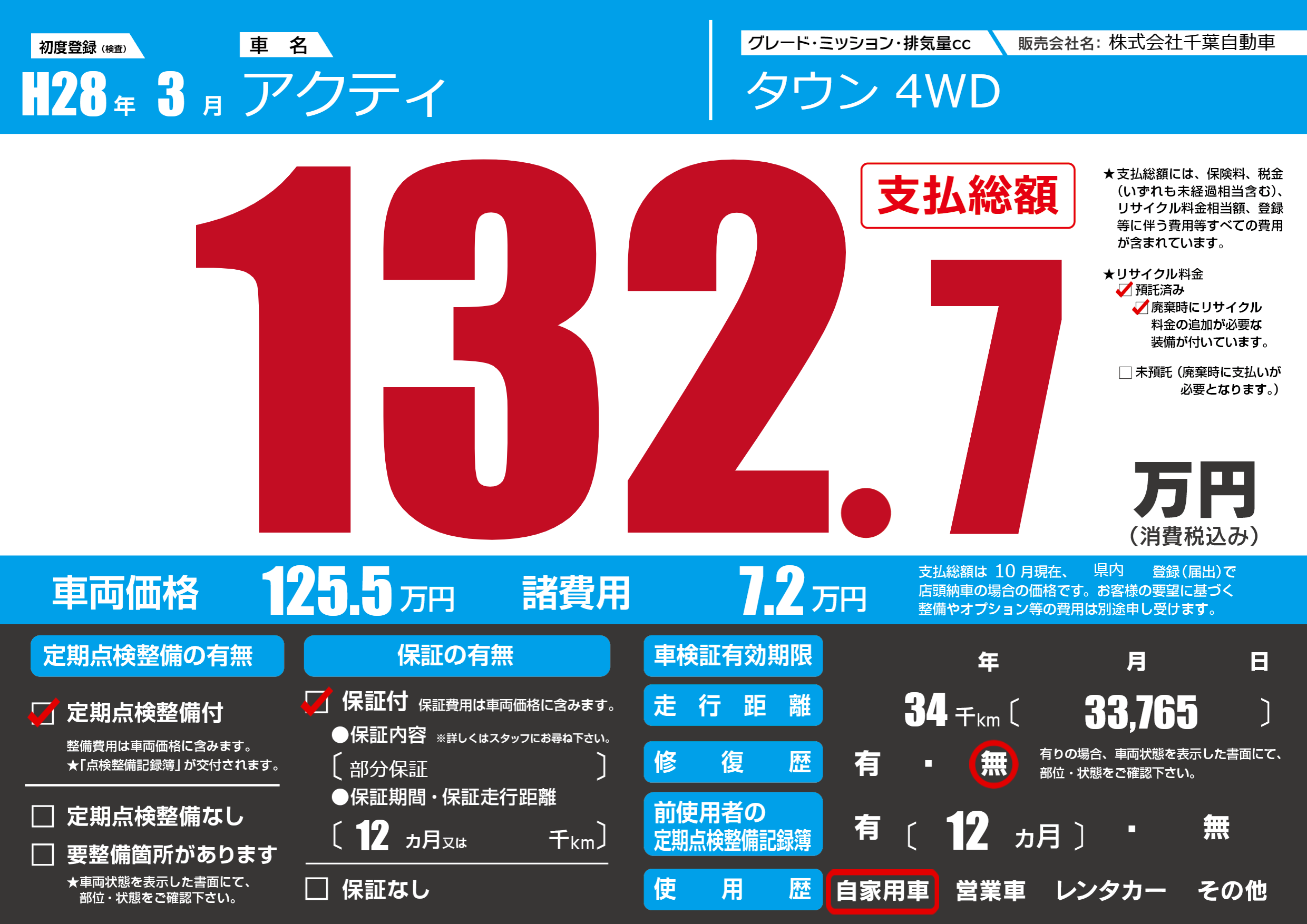 | 車名 | アクティ | グレード ミッション 排気量 |
