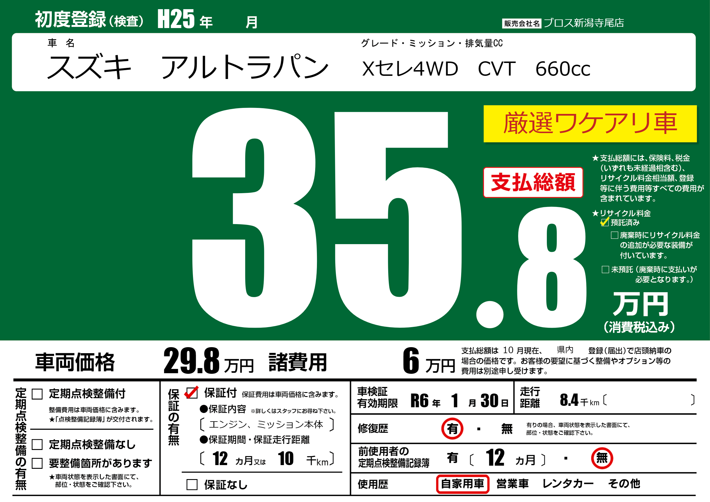| 走行キロ | 0.8万km | 初年度登録 | H25年---月 |