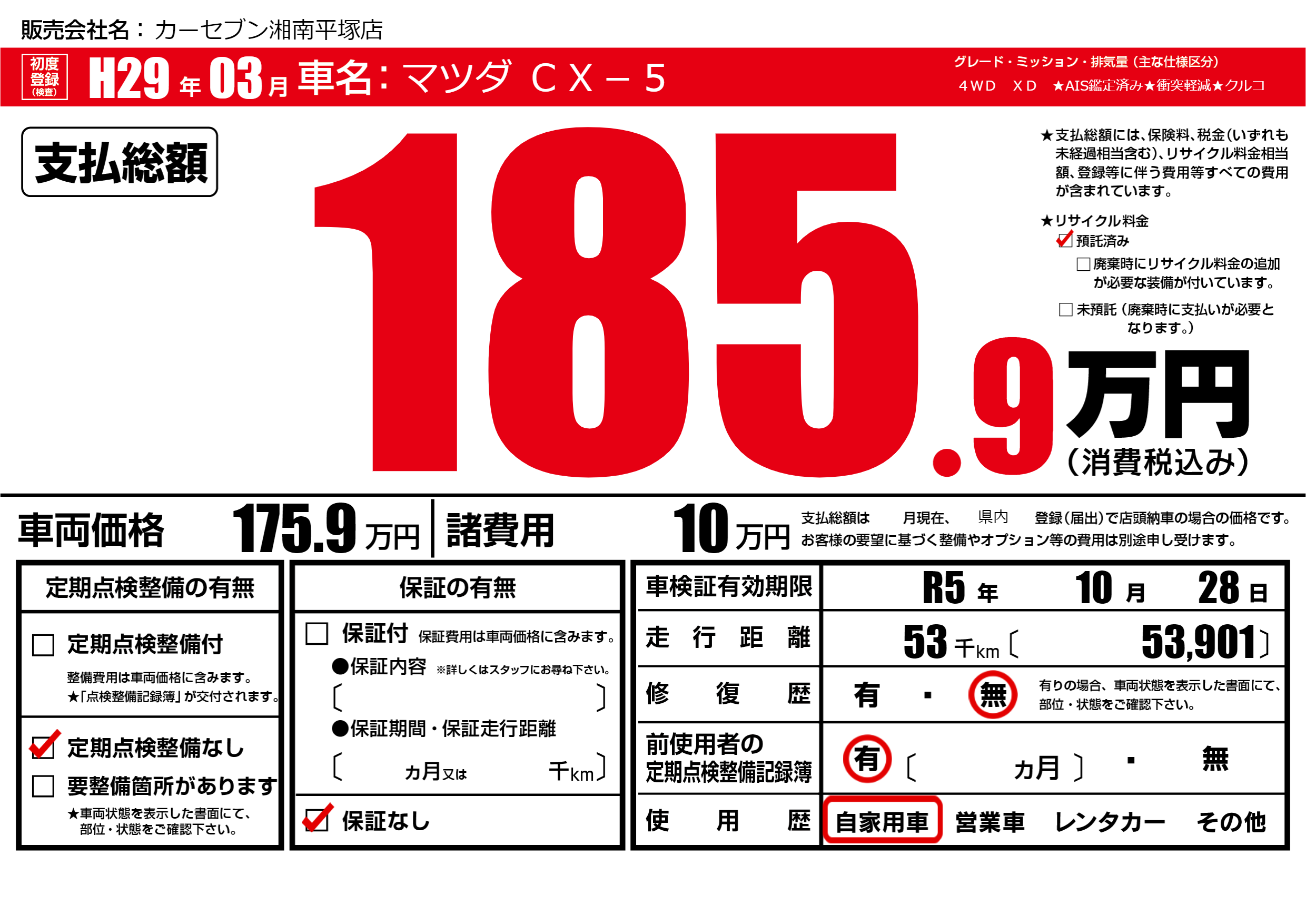 | 車名 | マツダ CX-5 | グレード ミッション 排気量 |