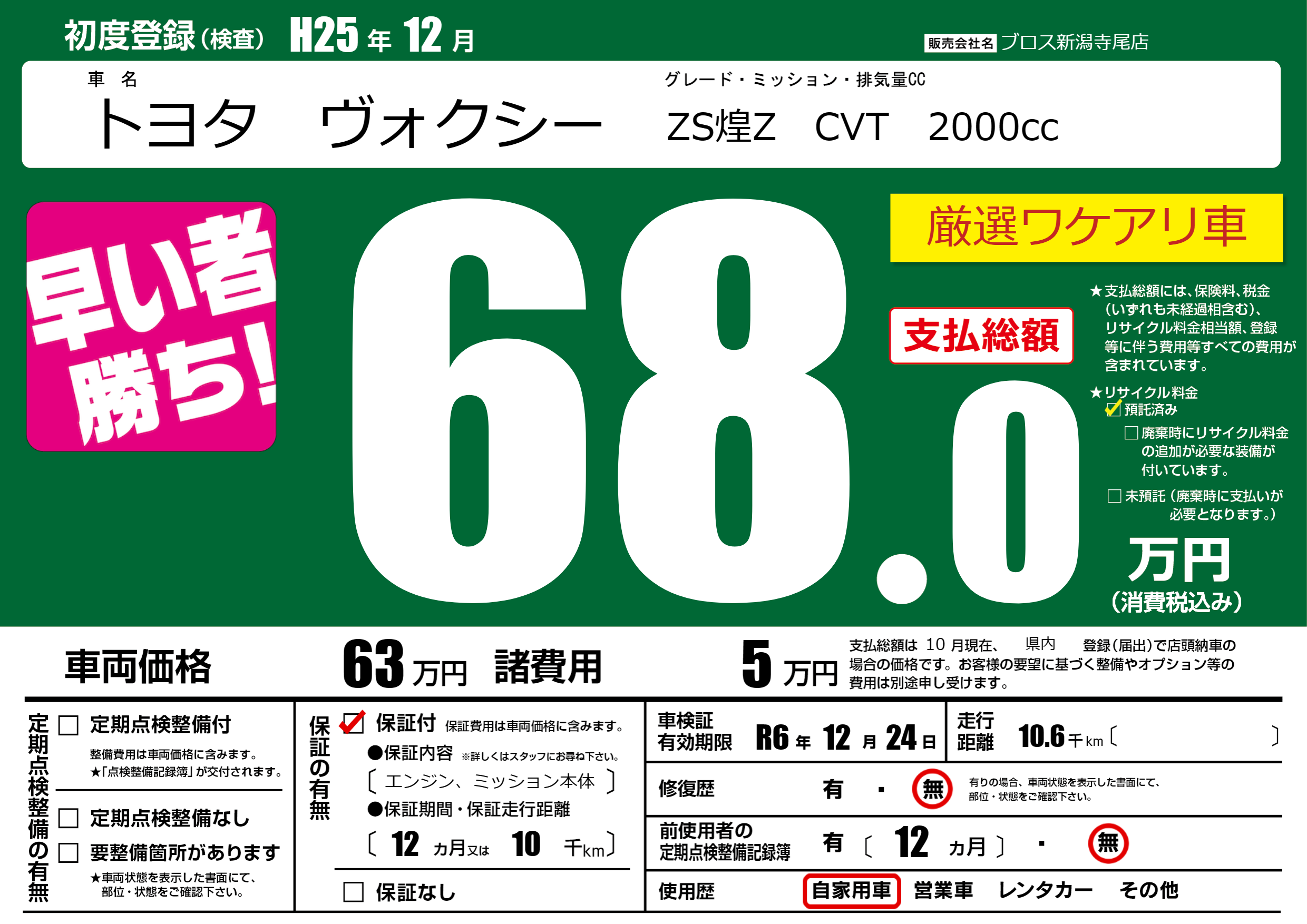 | 走行キロ | 1万km | 初年度登録 | H25年12月 |