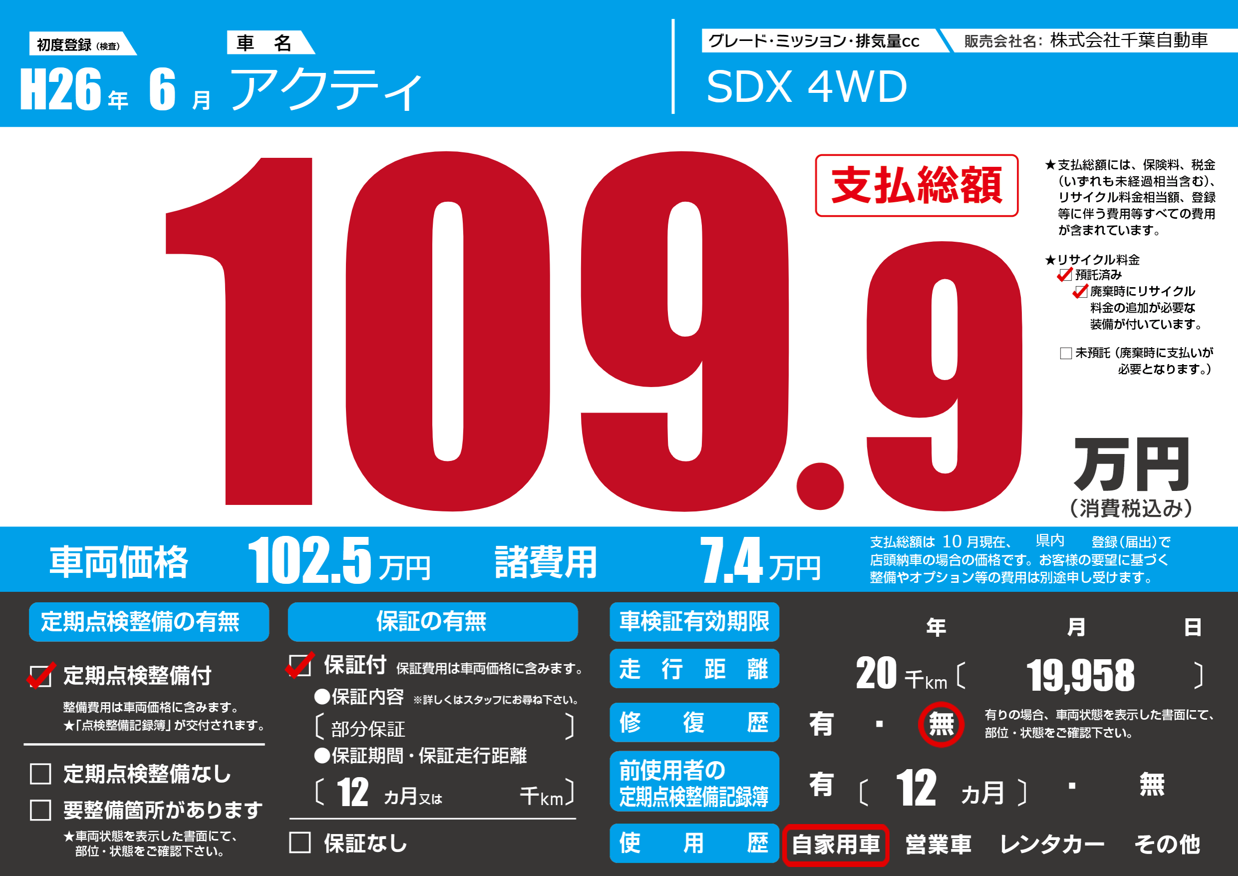 | 走行キロ | 2万km | 初年度登録 | H26年6月 |