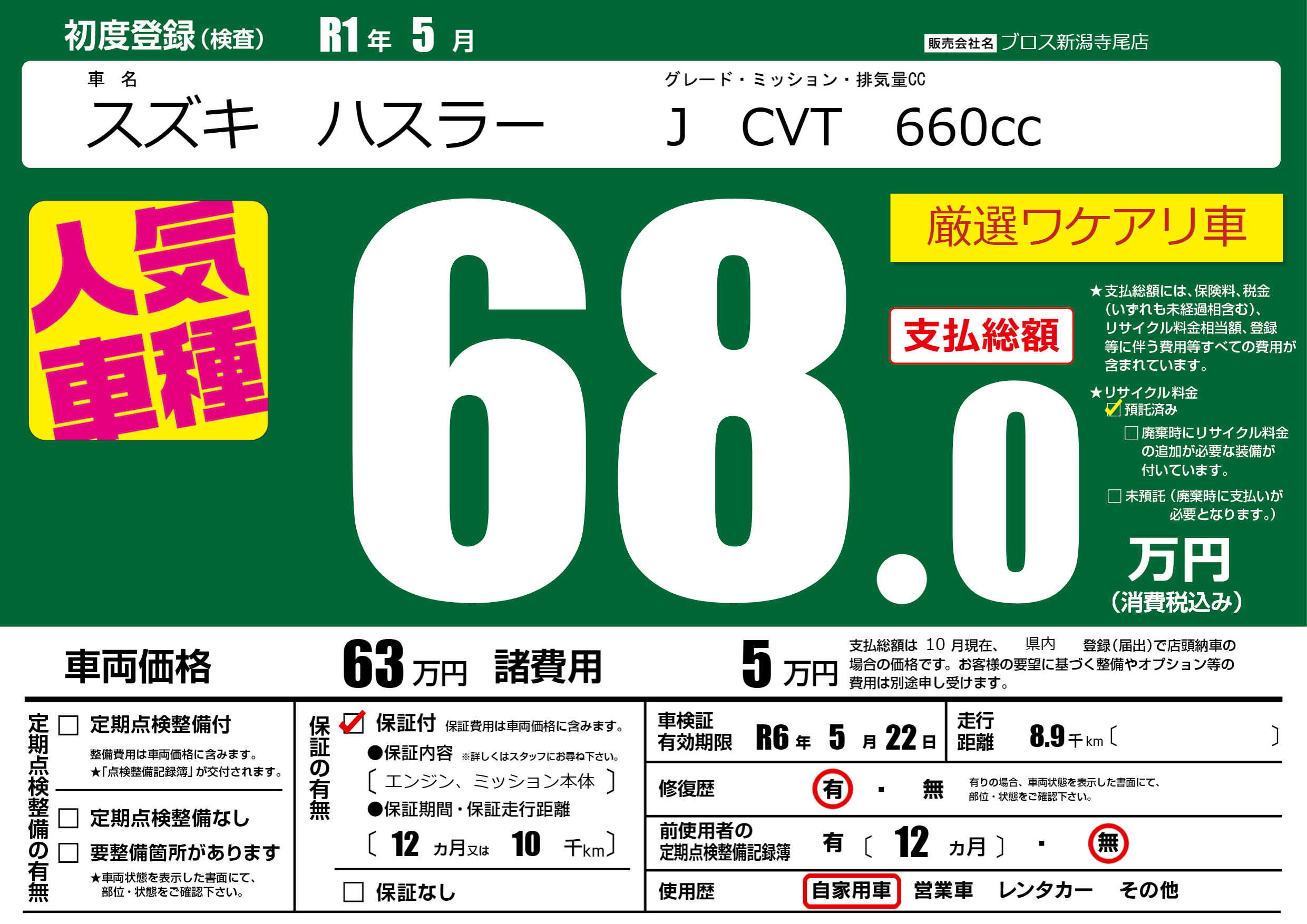 | 車名 | スズキ ハスラー | グレード ミッション 排気量 |