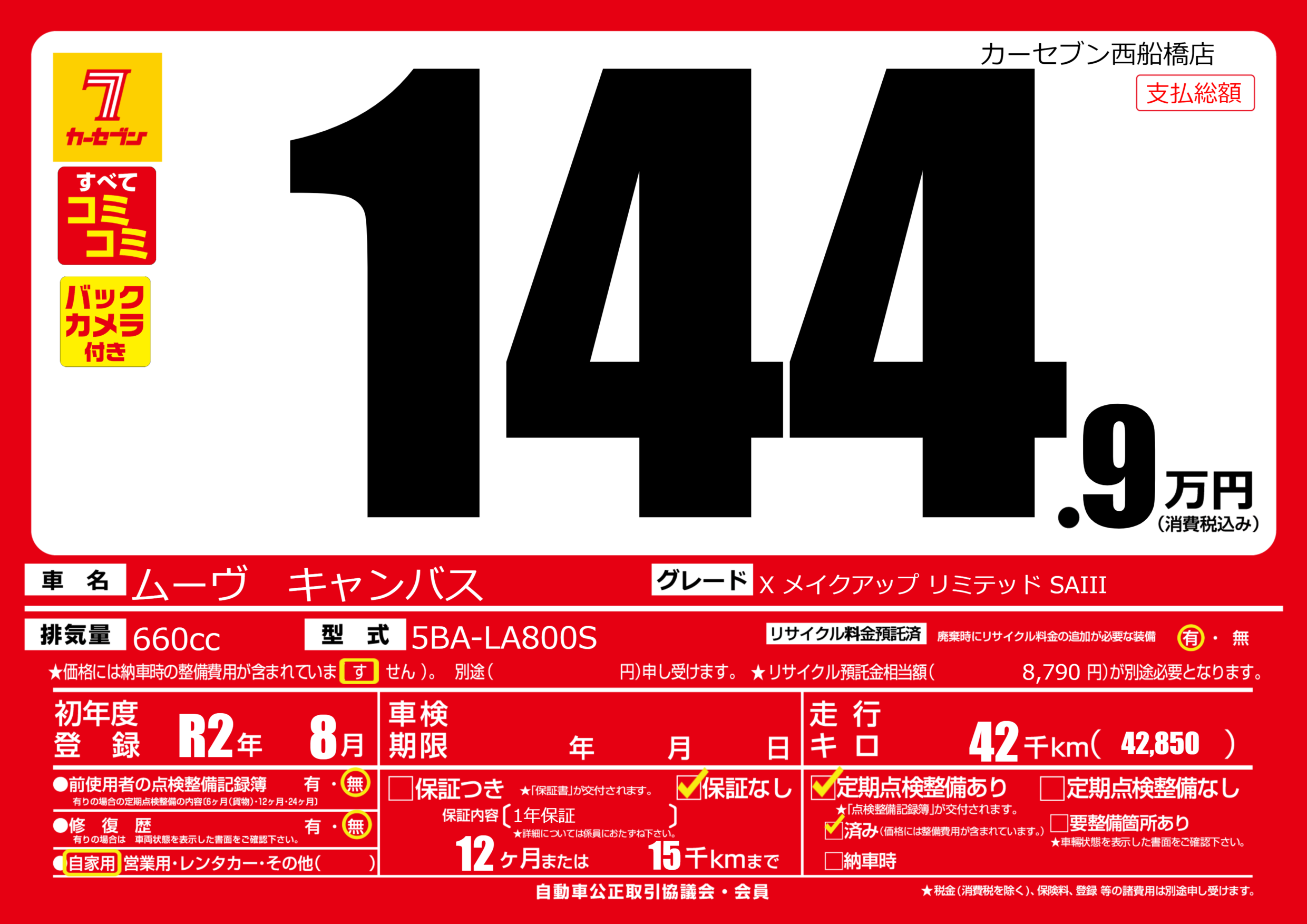 | 定期点検整備 | 定期点検整備あり 定期点検整備済み | ||