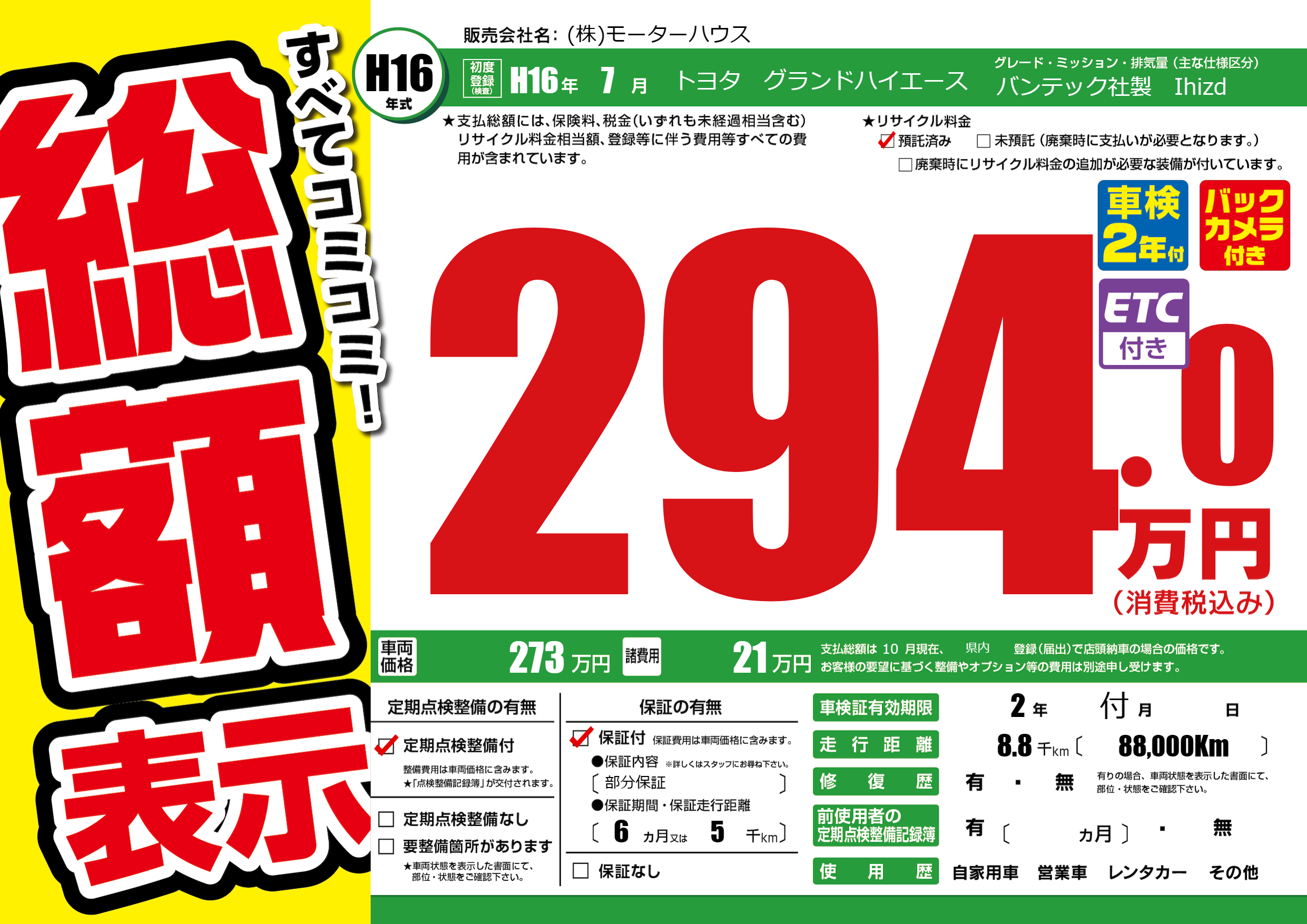 | 車名 | トヨタ グランドハイエース | グレード ミッション 排気量 |