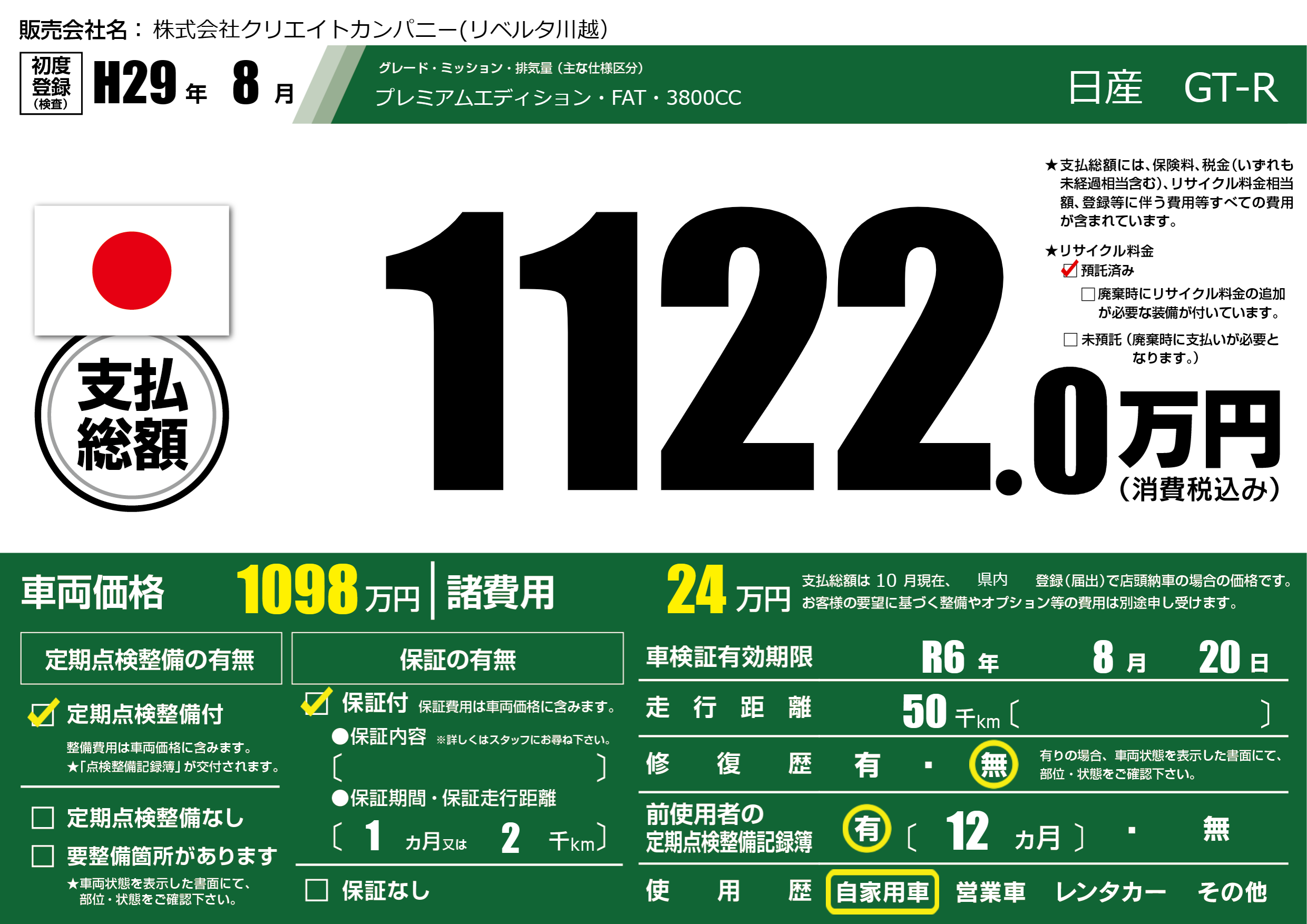 | 車名 | 日産 GT-R | グレード ミッション 排気量 |