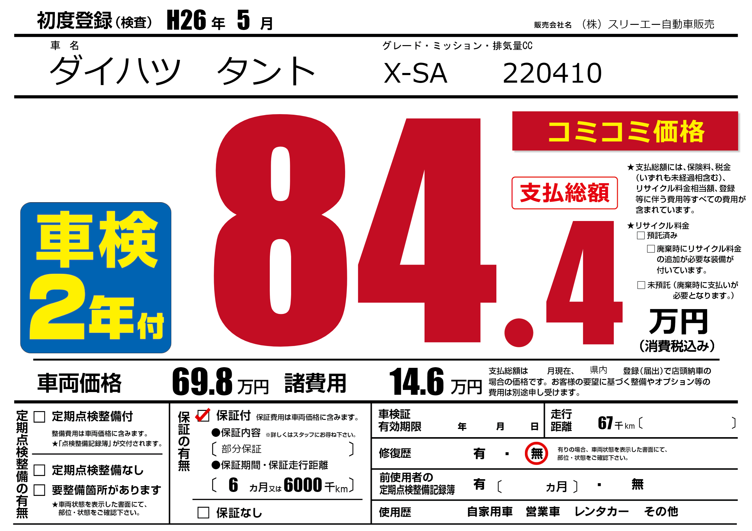 保証付き 保証内容(部分保証) 6ヶ月または(6000)千kmまで |