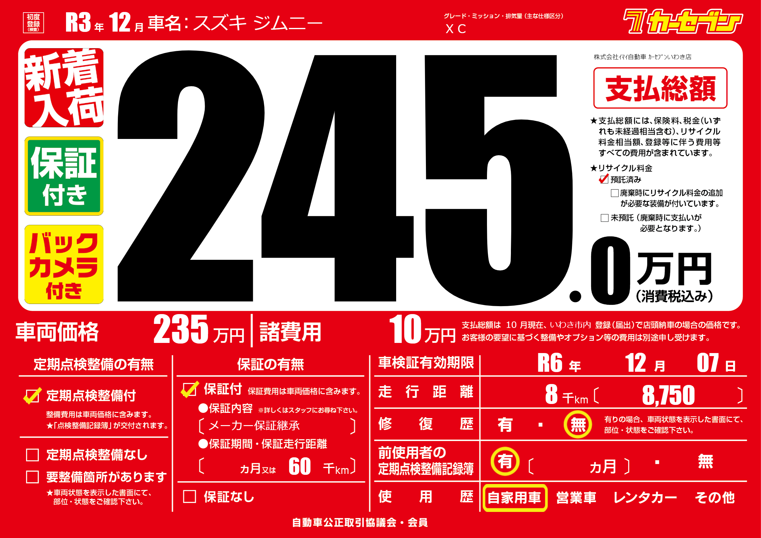 | 走行キロ | 0.8万km | 初年度登録 | R3年12月 |