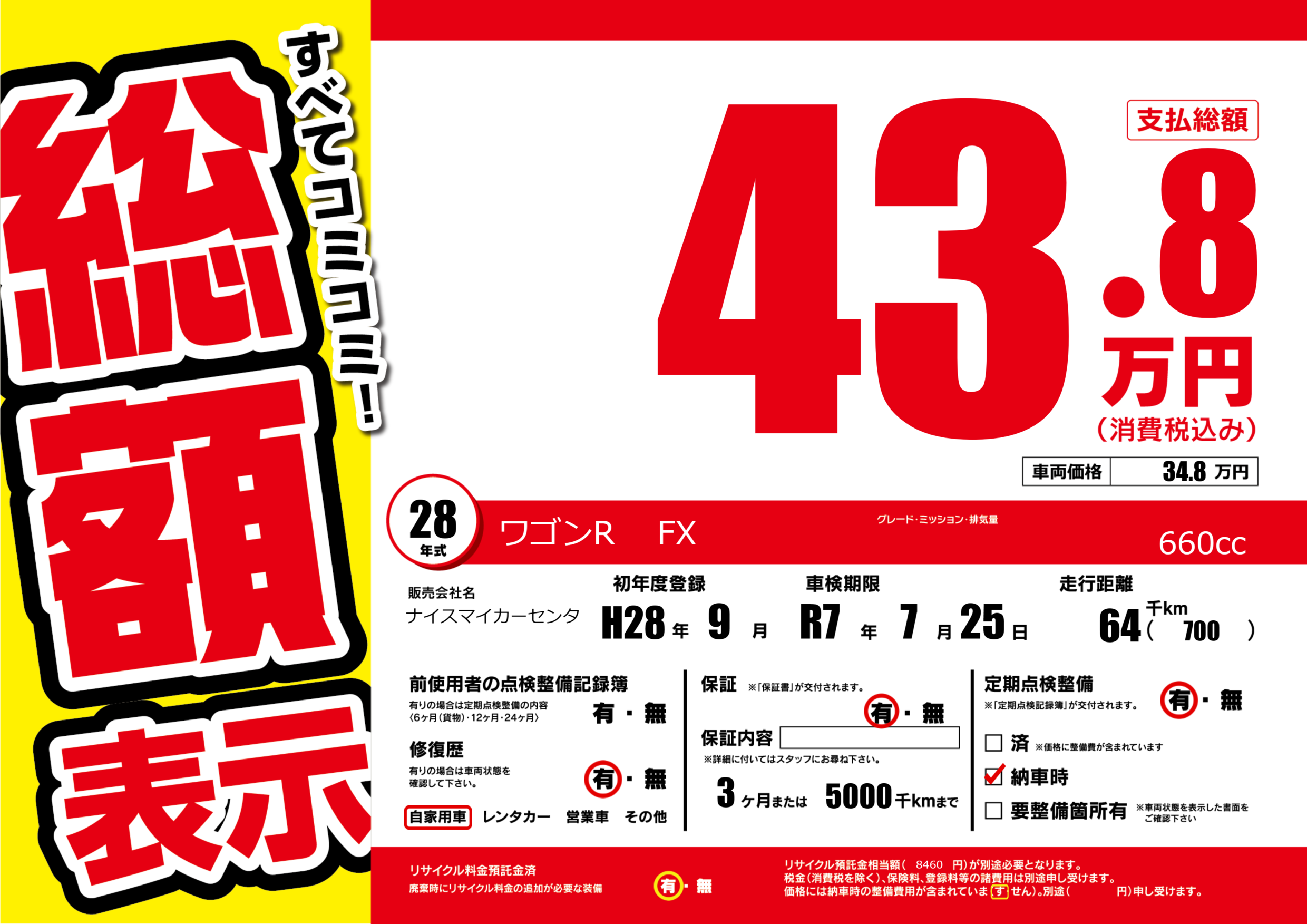 | 定期点検整備 | 定期点検整備あり 納車時あり | ||