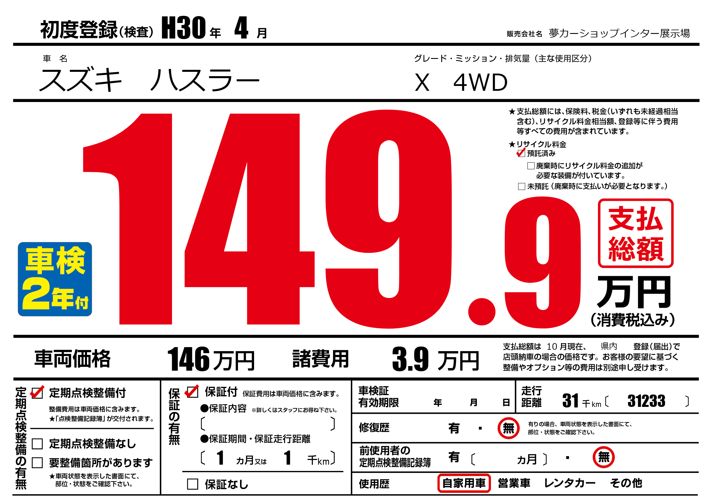 | 車名 | スズキ ハスラー | グレード ミッション 排気量 |