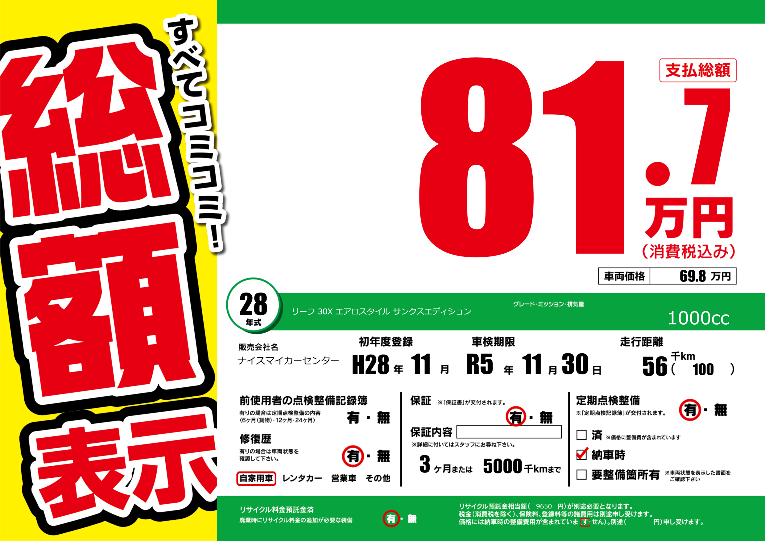 | 定期点検整備 | 定期点検整備あり 納車時あり | ||