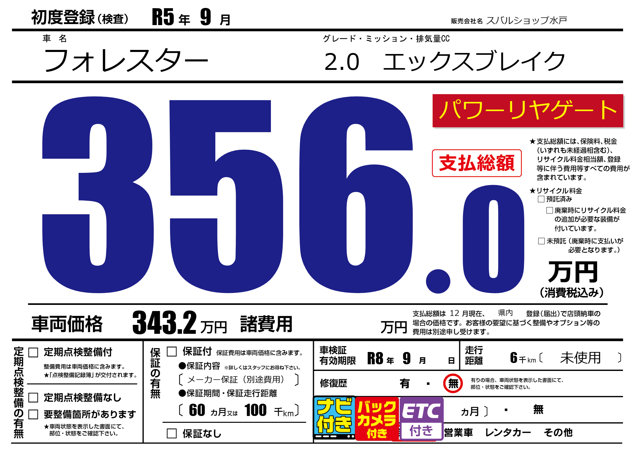 | 車名 | フォレスター | グレード ミッション 排気量 |