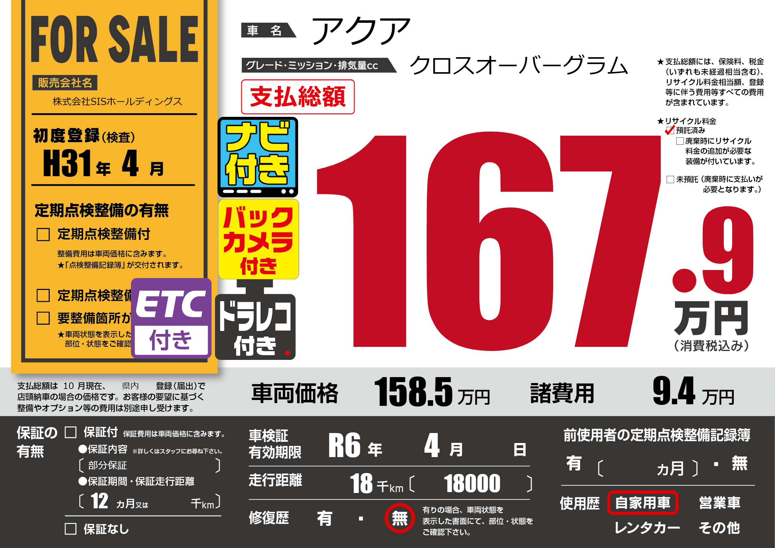 | 走行キロ | 1.8万km | 初年度登録 | H31年4月 |