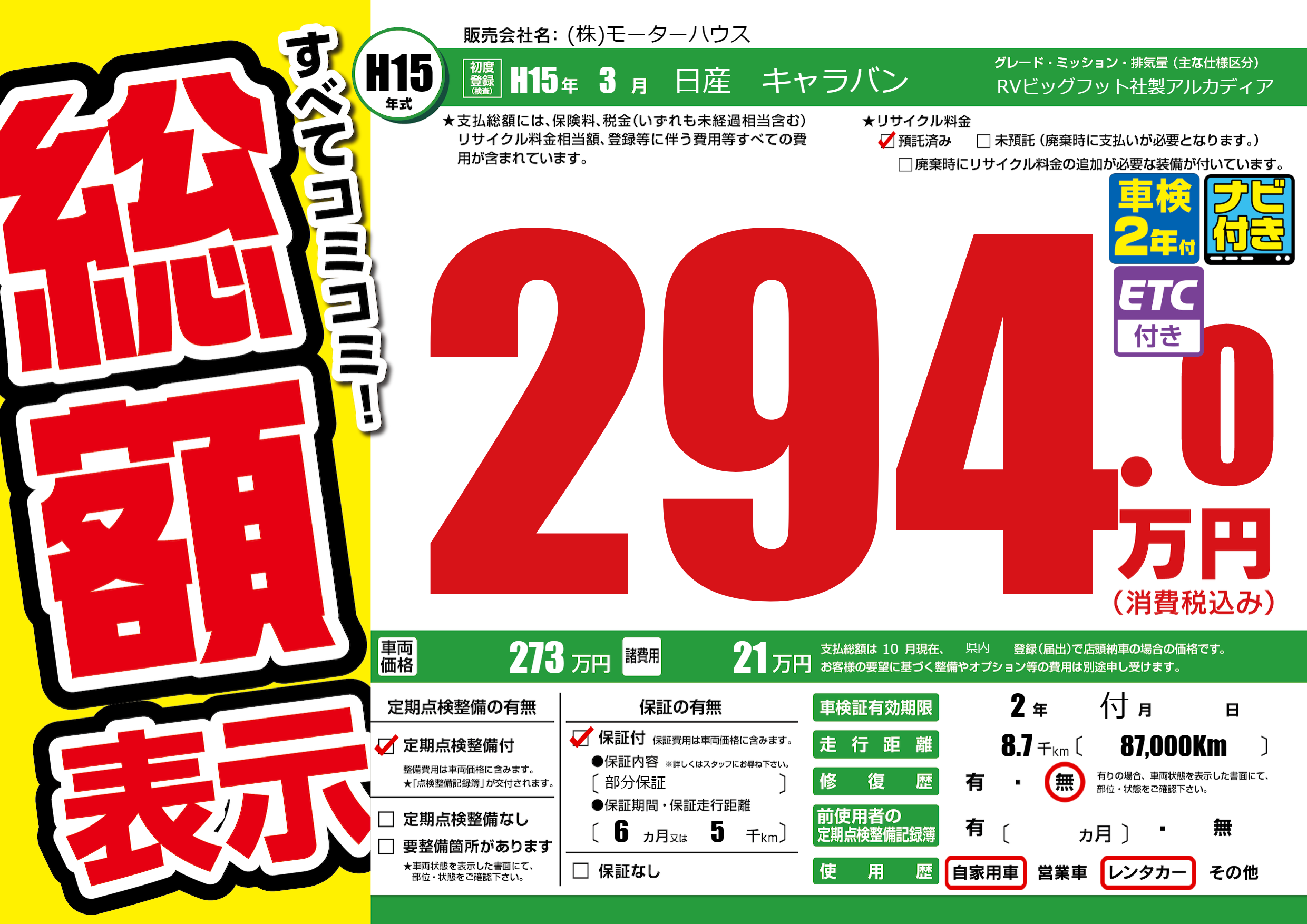 | 車名 | 日産 キャラバン | グレード ミッション 排気量 |