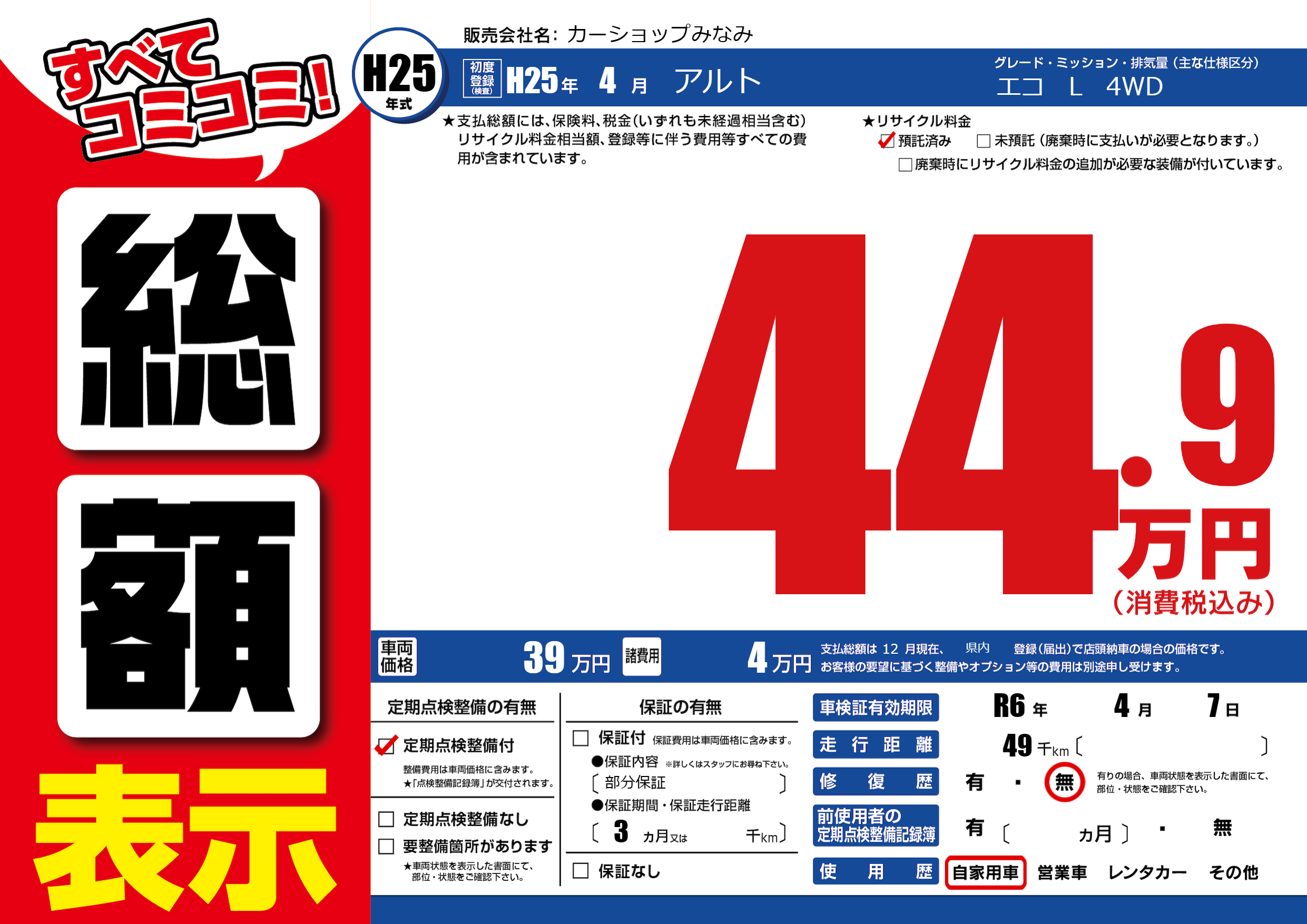 | 走行キロ | 4.9万km | 初年度登録 | H25年4月 |