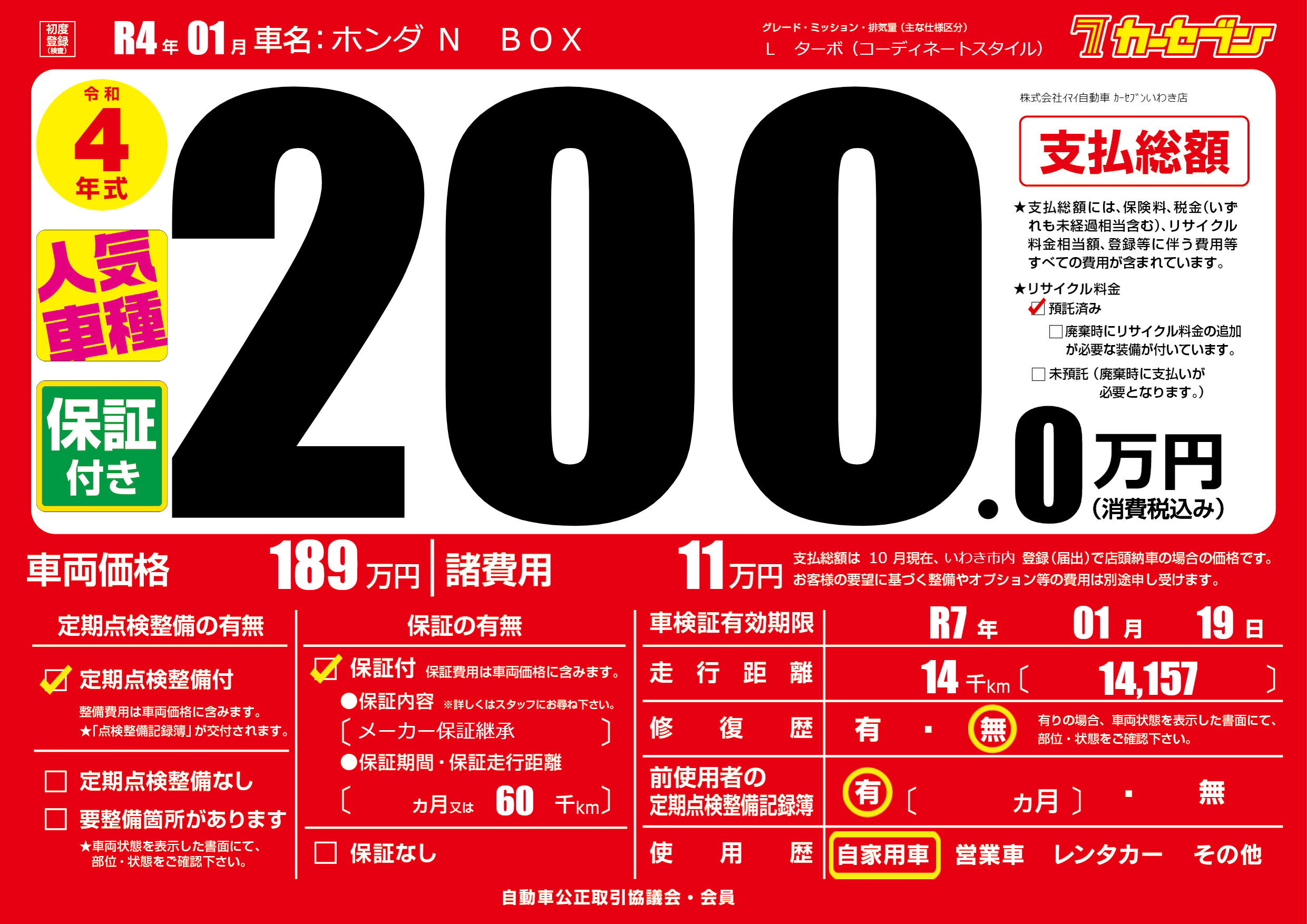 | 車名 | ホンダ N BOX | グレード ミッション 排気量 |