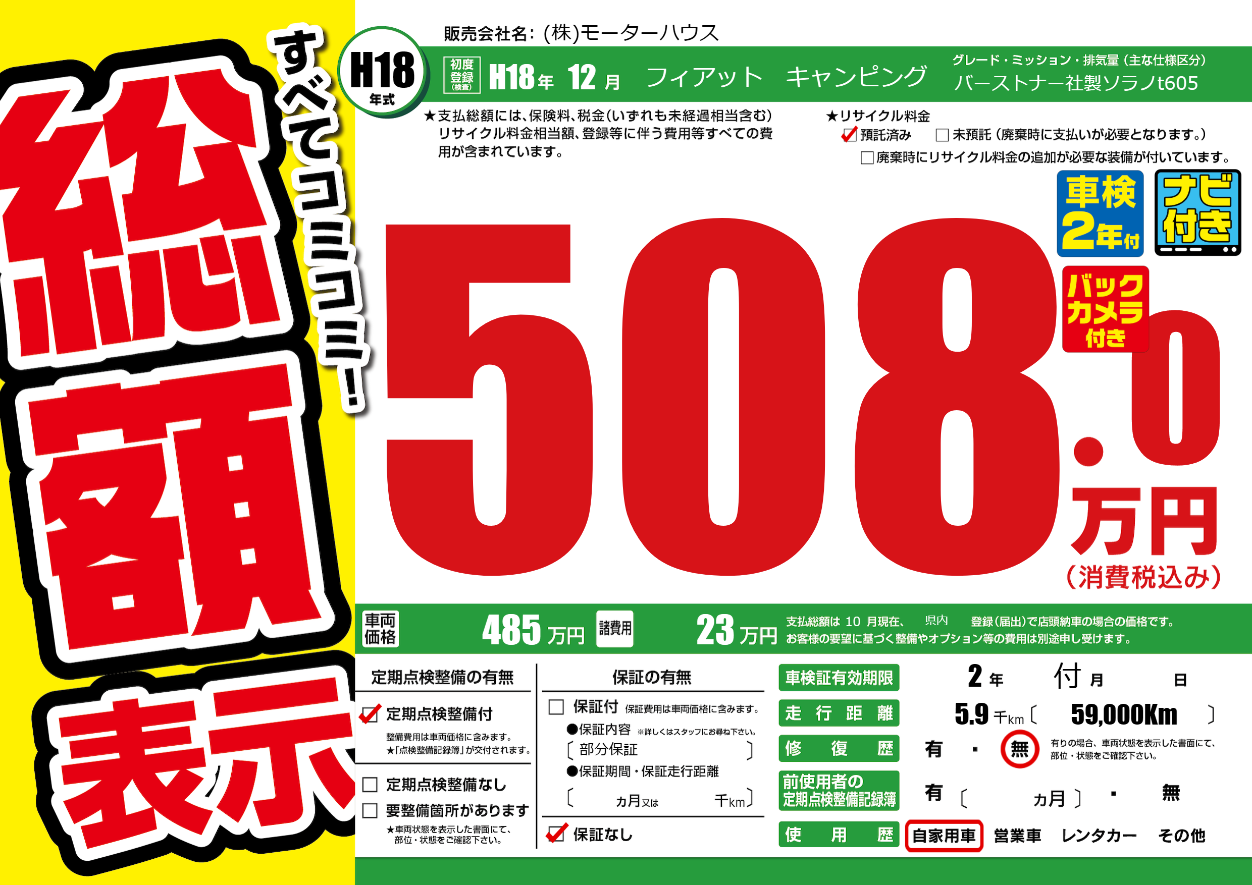 | 車名 | フィアット キャンピング | グレード ミッション 排気量 |
