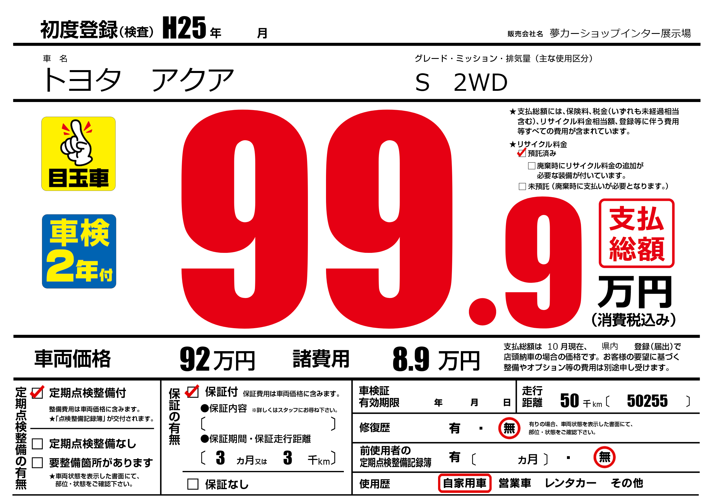 | 車名 | トヨタ アクア | グレード ミッション 排気量 |