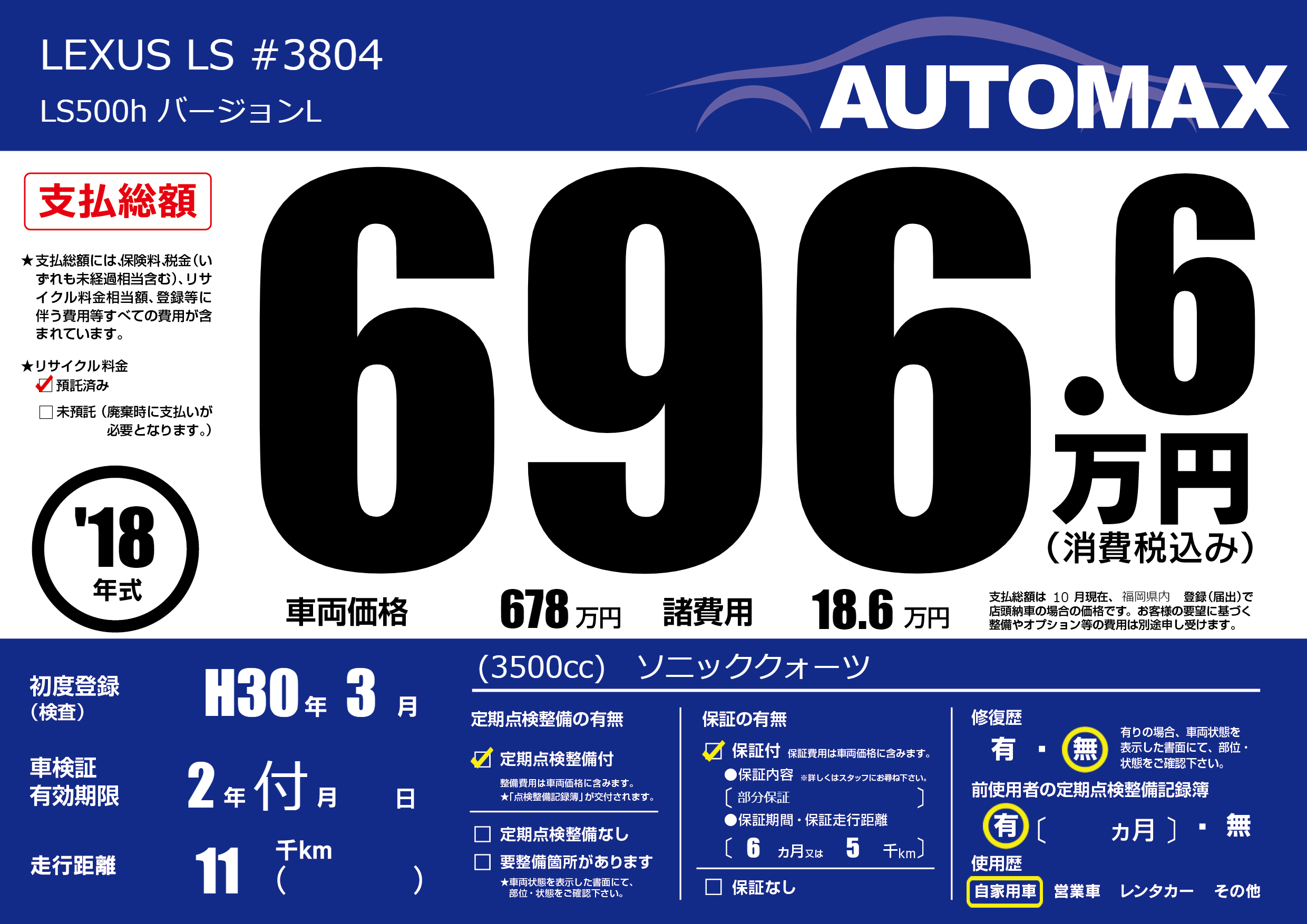 | 車名 | LEXUS LS #3804 | グレード ミッション 排気量 |