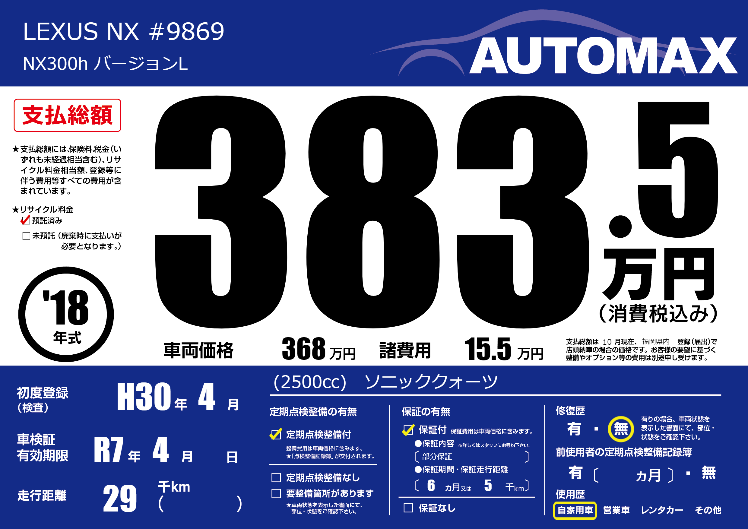 | 車名 | LEXUS NX #9869 | グレード ミッション 排気量 |