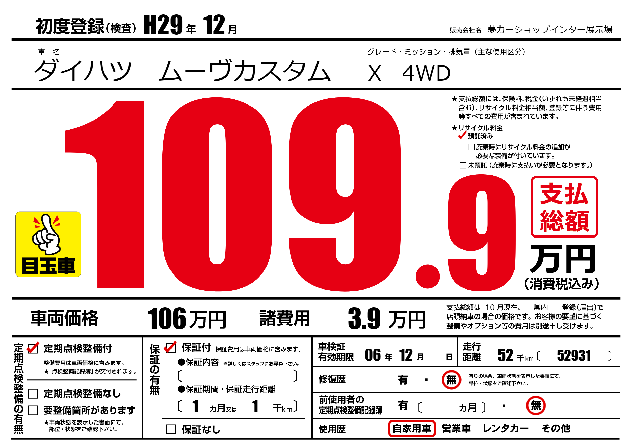 | 車名 | ダイハツ ムーヴカスタム | グレード ミッション 排気量 |