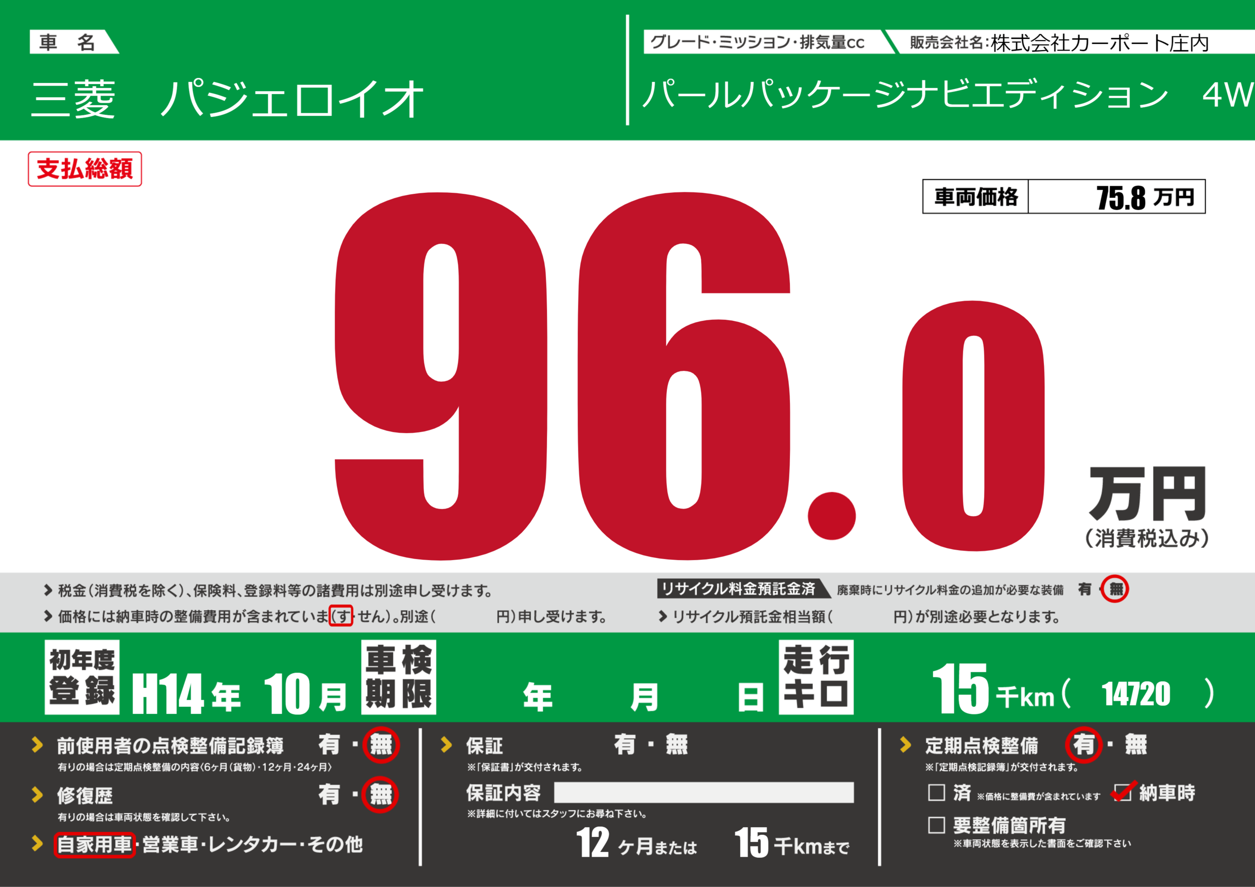 | 定期点検整備 | 定期点検整備あり 納車時あり | ||