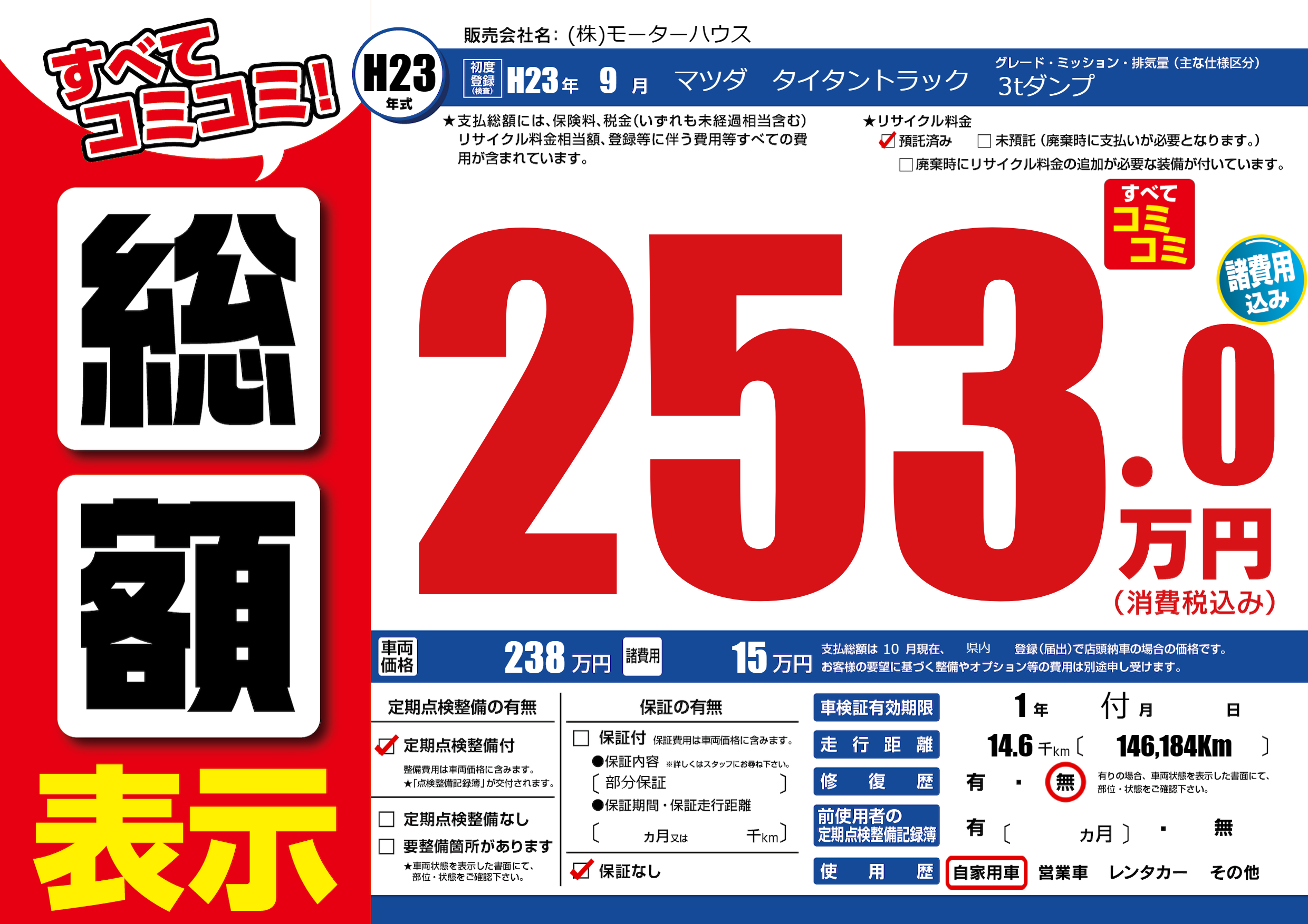 | 車名 | マツダ タイタントラック | グレード ミッション 排気量 |