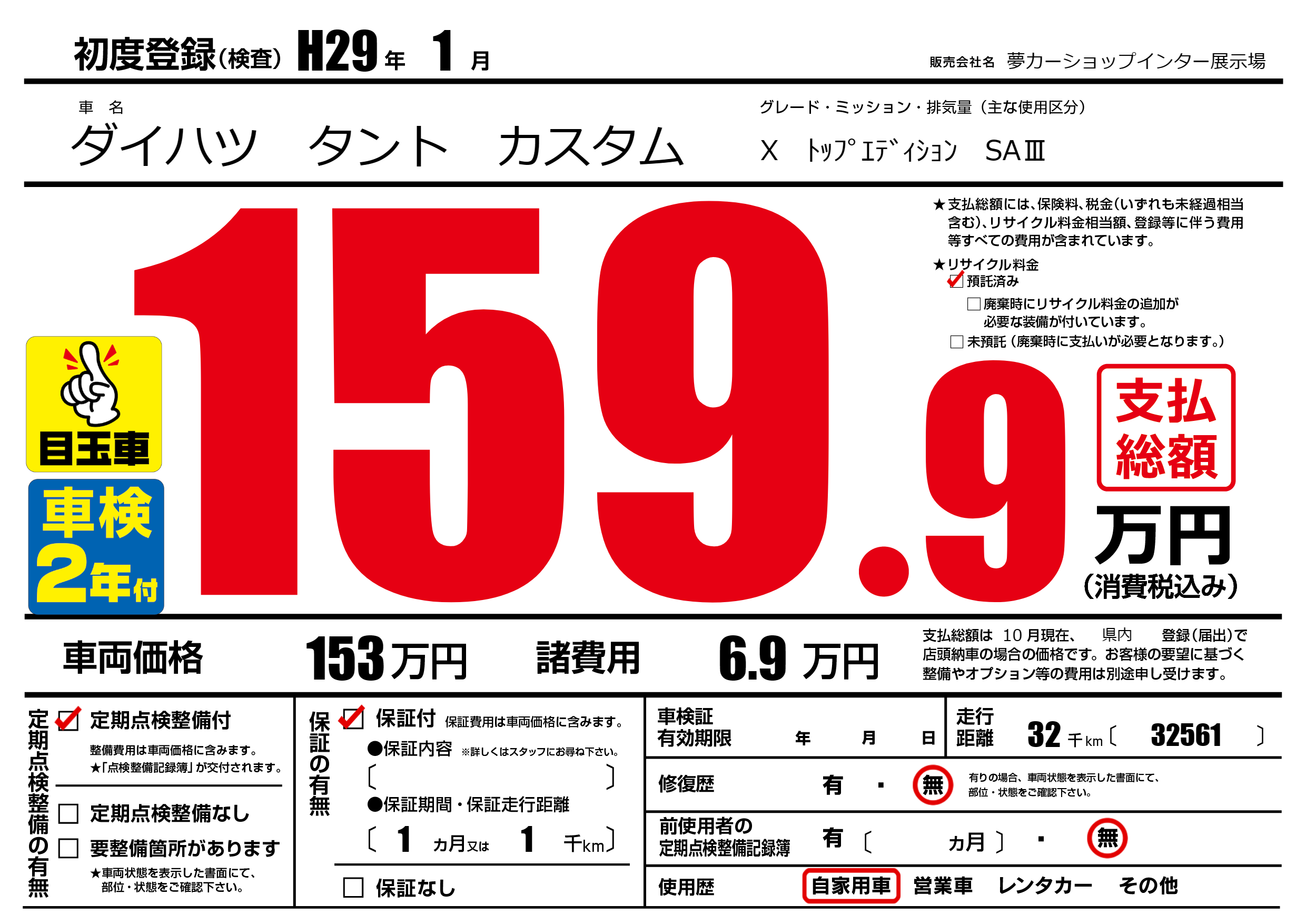 | 車名 | ダイハツ タント カスタム | グレード ミッション 排気量 |