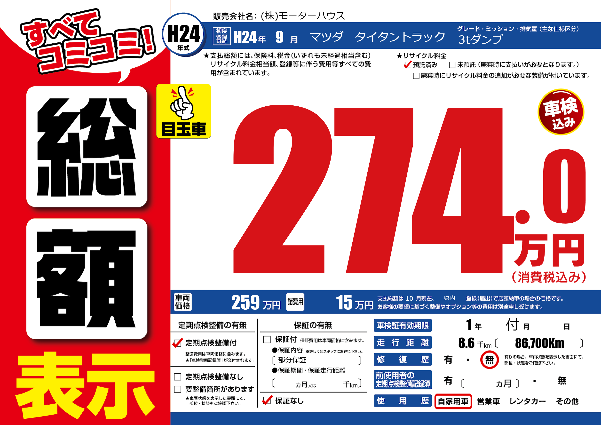 | 車名 | マツダ タイタントラック | グレード ミッション 排気量 |