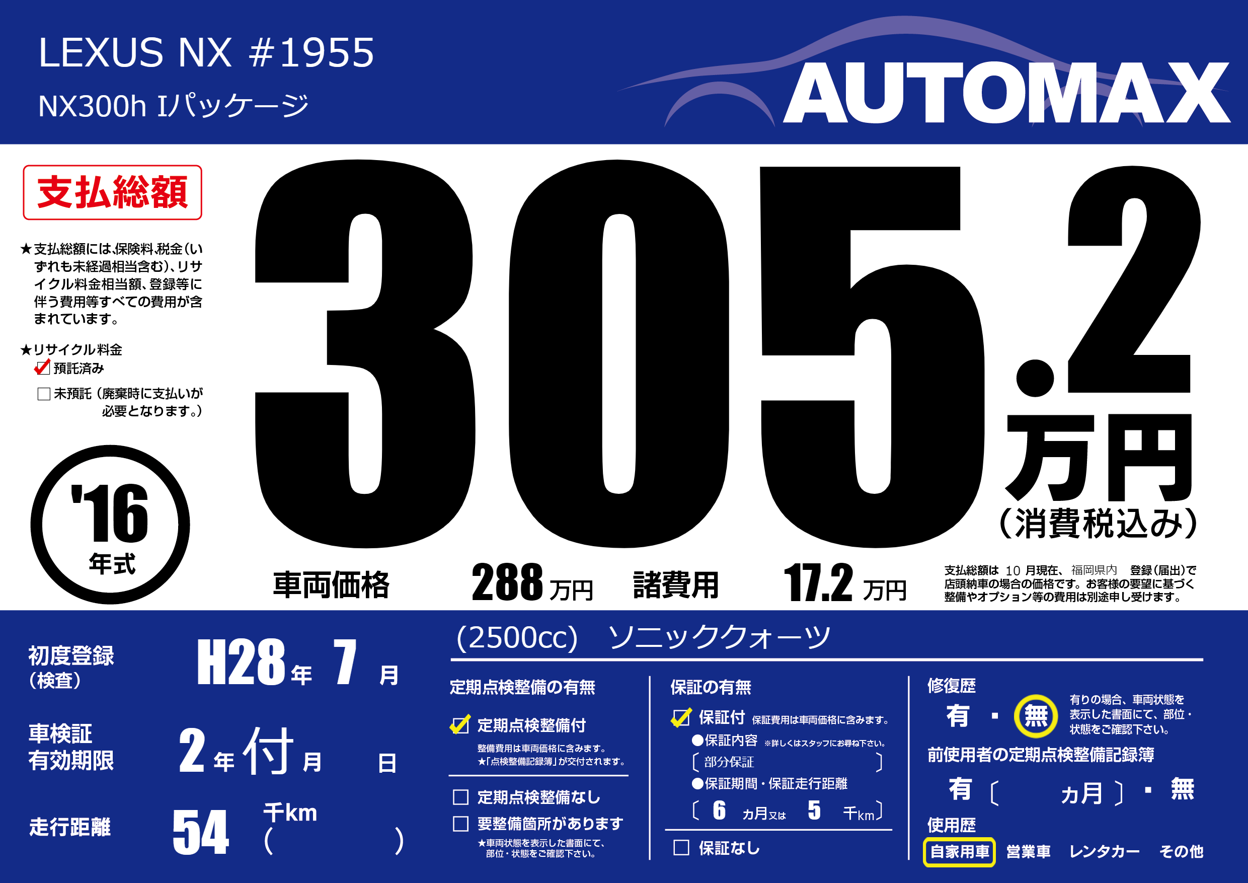 | 車名 | LEXUS NX #1955 | グレード ミッション 排気量 |