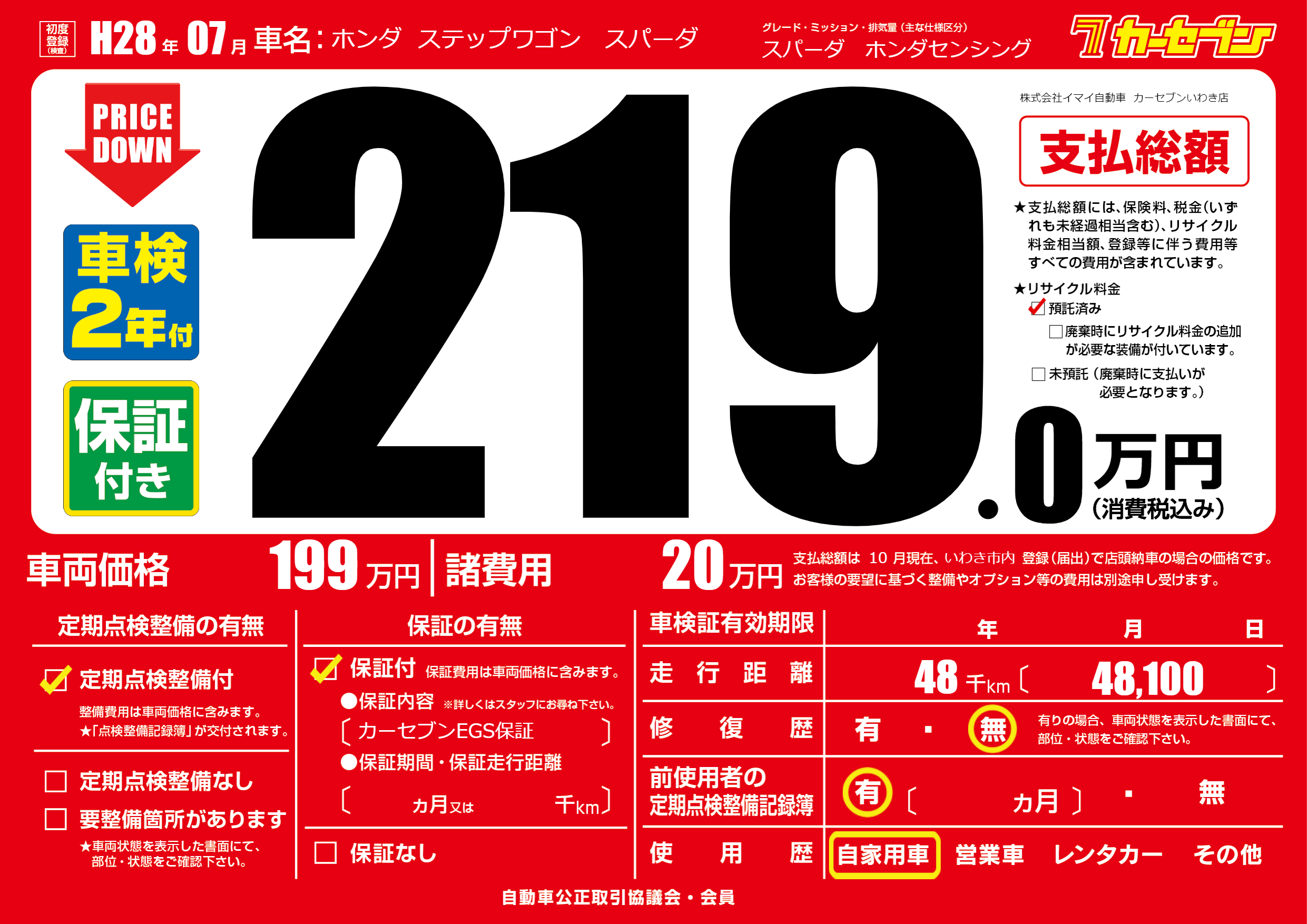 | 走行キロ | 4.8万km | 初年度登録 | H28年07月 |