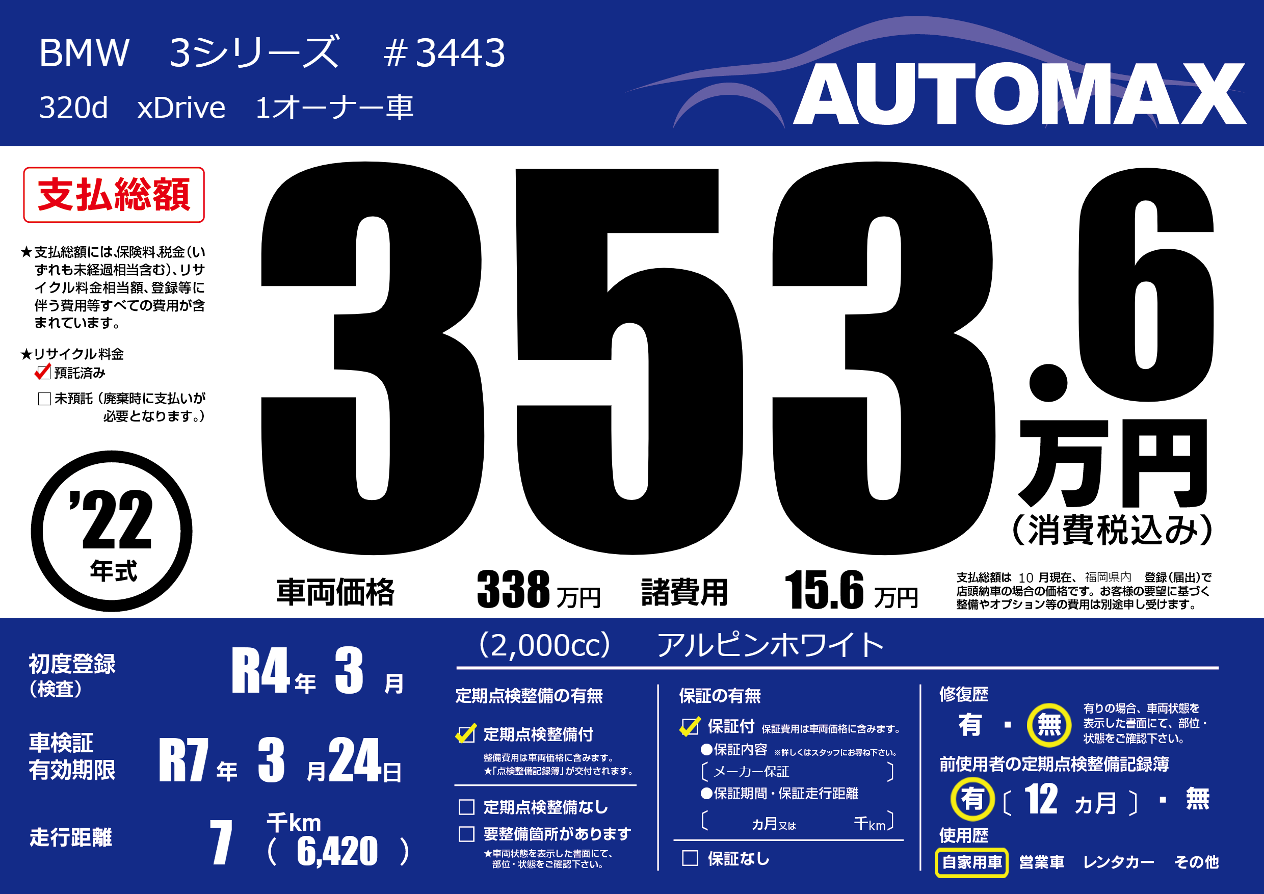 | 車名 | BMW 3シリーズ #3443 | グレード ミッション 排気量 |