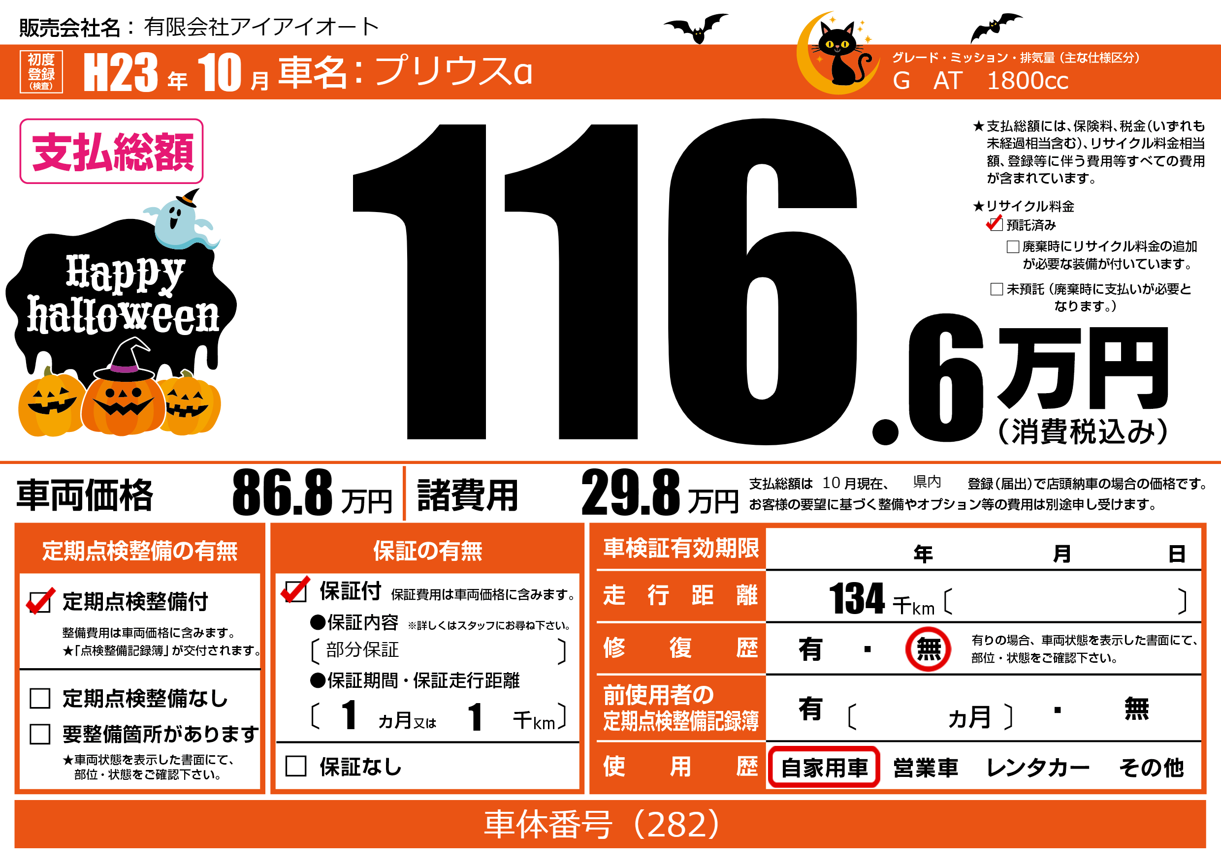 | 走行キロ | 13.4万km | 初年度登録 | H23年10月 |