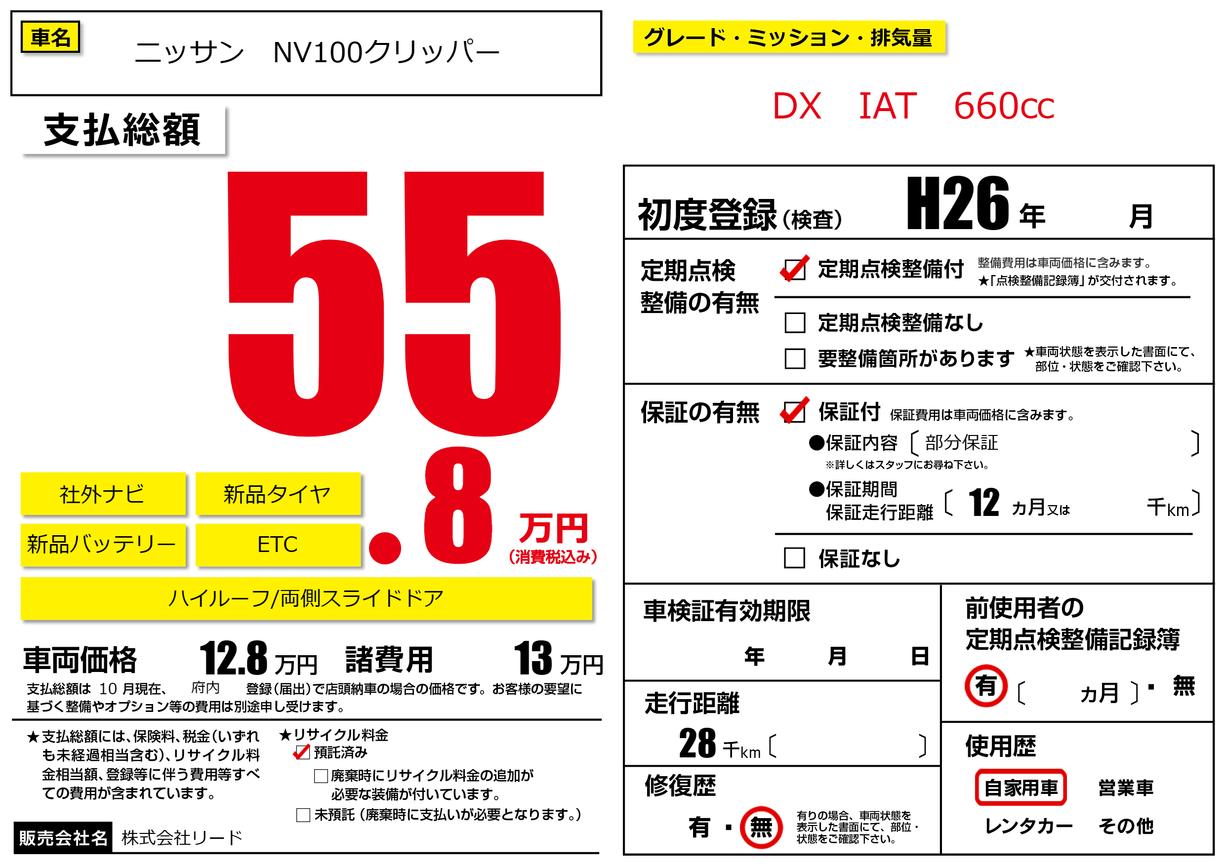 | 車名 | ニッサン NV100クリッパー | グレード ミッション 排気量 |