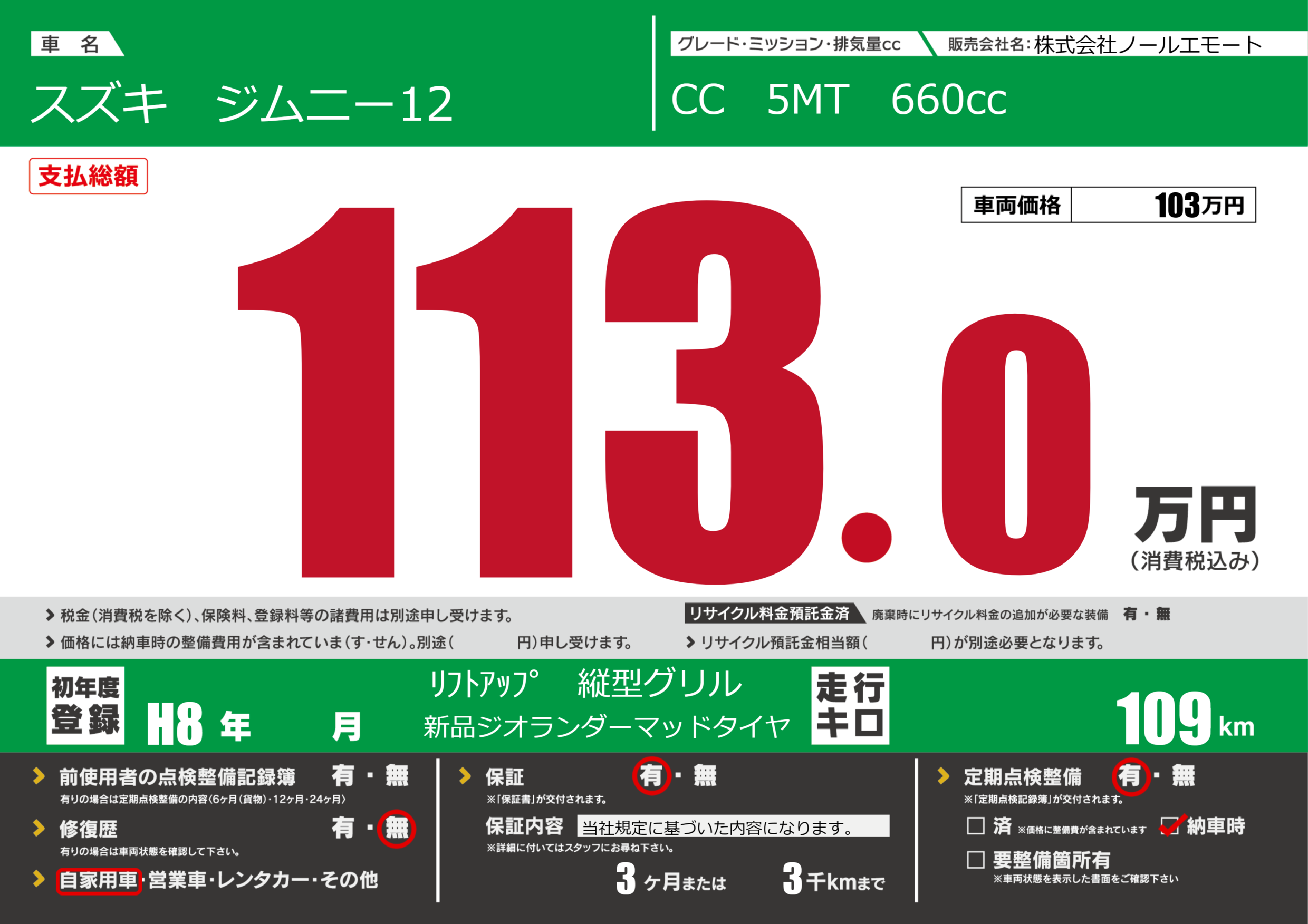 | 車名 | スズキ ジムニー12 | グレード ミッション 排気量 |