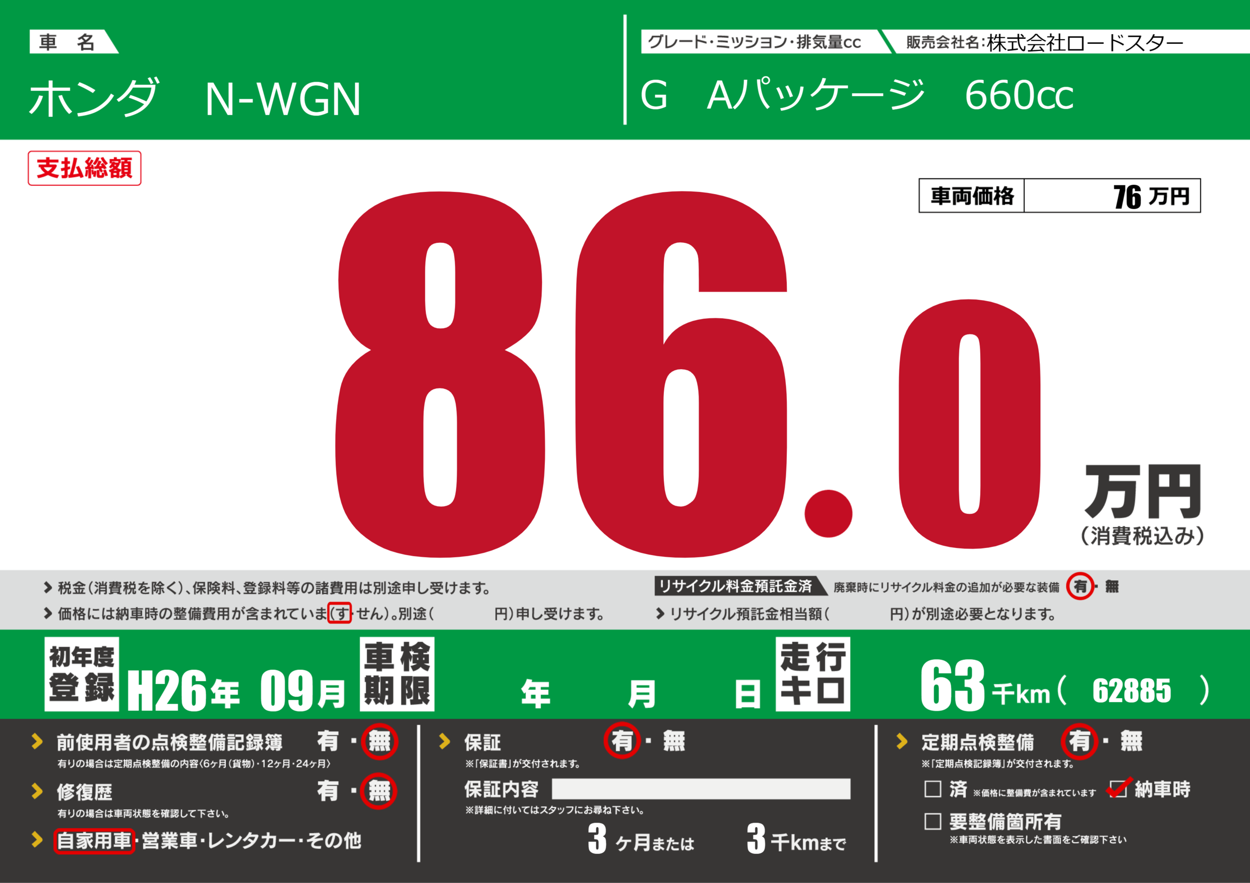 | 車名 | ホンダ N-WGN | グレード ミッション 排気量 |