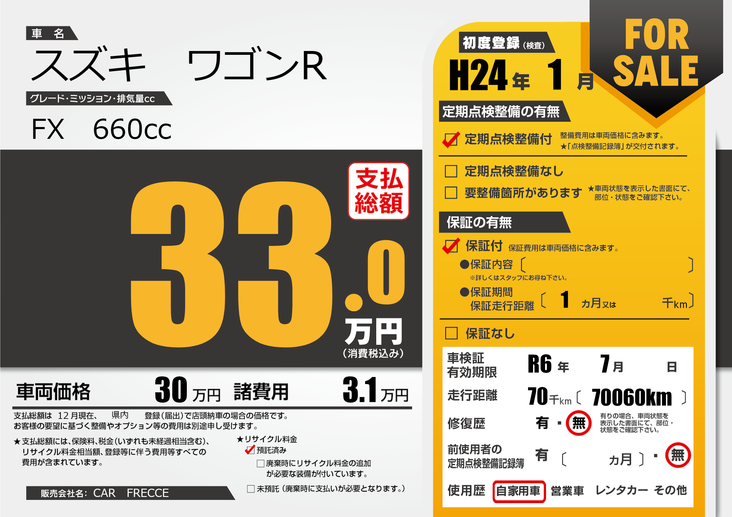 | 走行キロ | 7万km | 初年度登録 | H24年1月 |