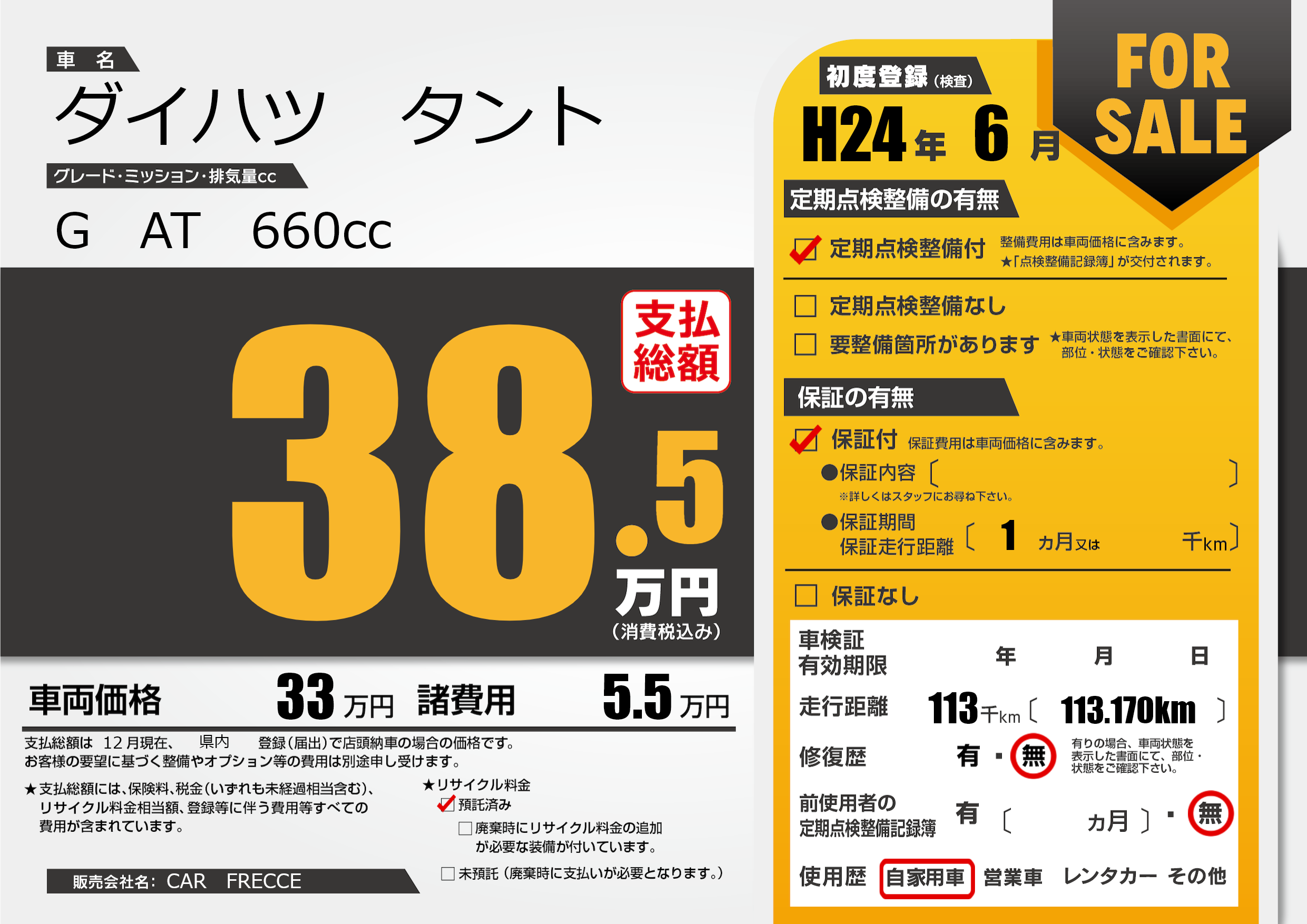 | 車名 | ダイハツ タント | グレード ミッション 排気量 |