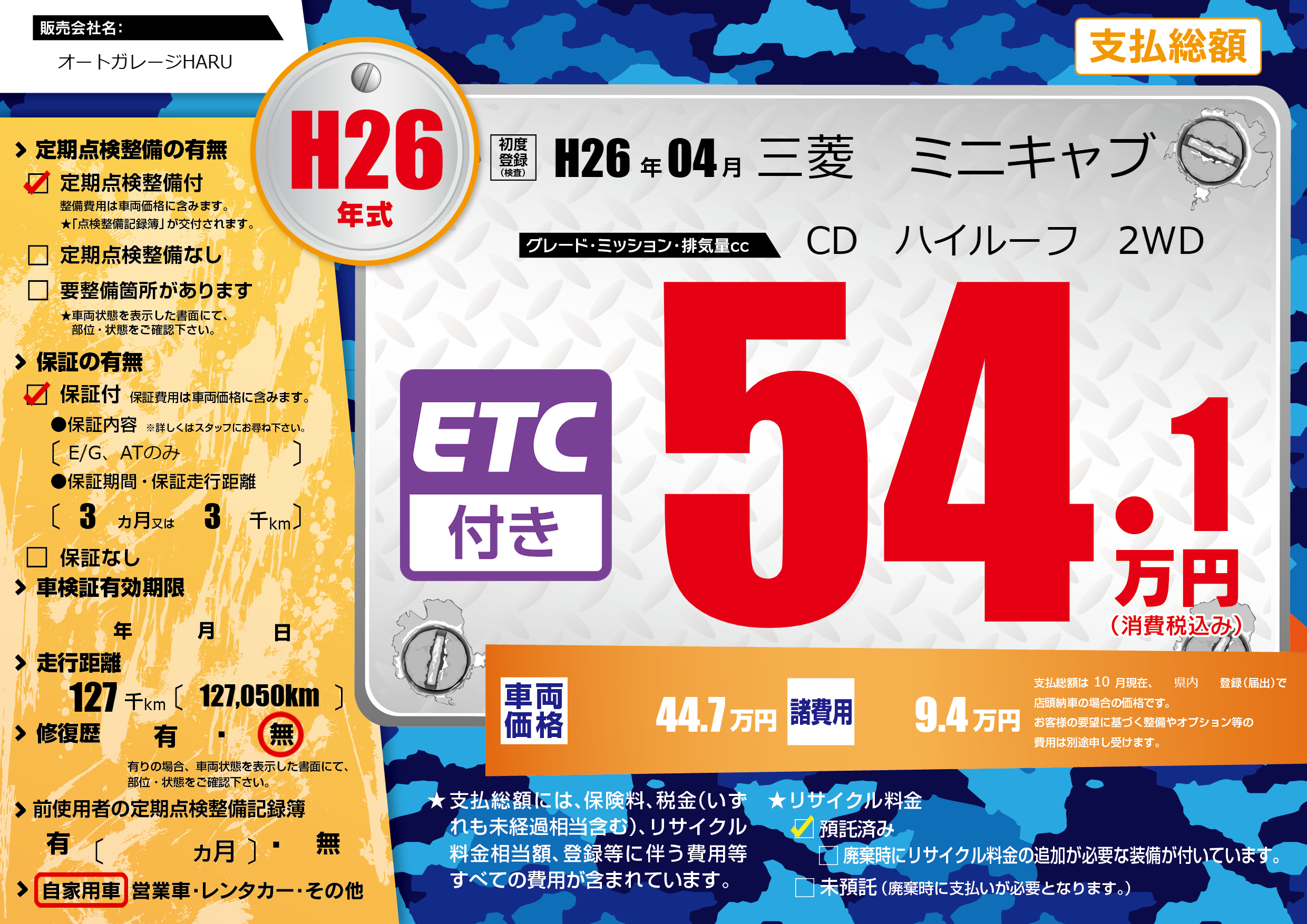 | 走行キロ | 12.7万km | 初年度登録 | H26年04月 |