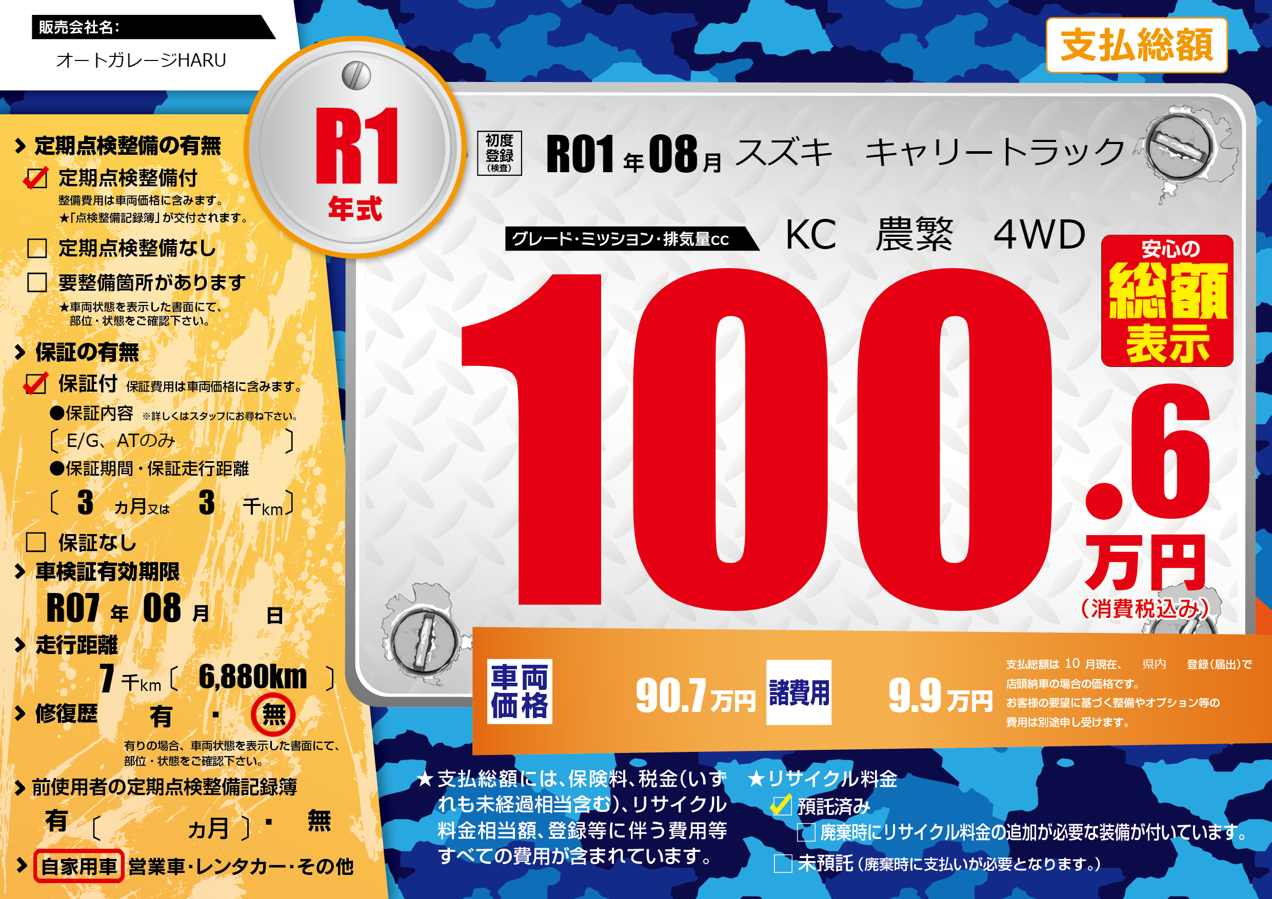 | 車名 | スズキ キャリートラック | グレード ミッション 排気量 |